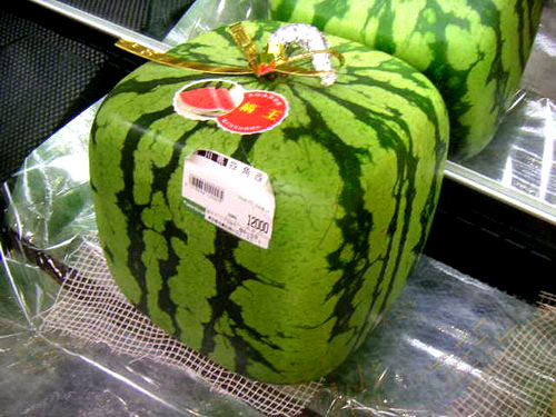 Первые сообщения об удивительных квадратных арбузах появились в 2004 году. Перед японскими овощеводами была поставлена задача вырастить арбуз необычной формы и при этом облегчить его транспортировку и хранение. После лабораторных исследований удалось найти простое, оригинальное и доступное решение. Оказалось, если поместить плод арбуза на ранней стадии роста в емкость, то он постепенно заполнит ее объем и примет такую же форму.