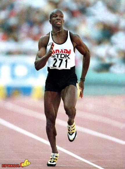 Донован Бейлей (Donovan Bailey). На олимпийских играх бежал со скоростью 43 км/ч. Вообще же, в среднем человек может развивать скорость до 30 км/ч.