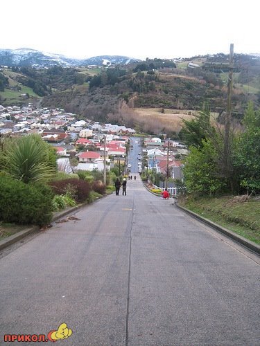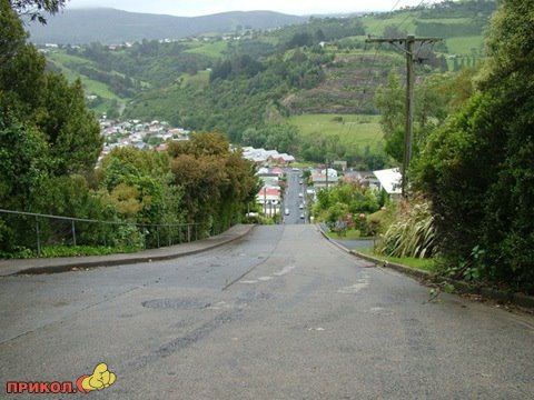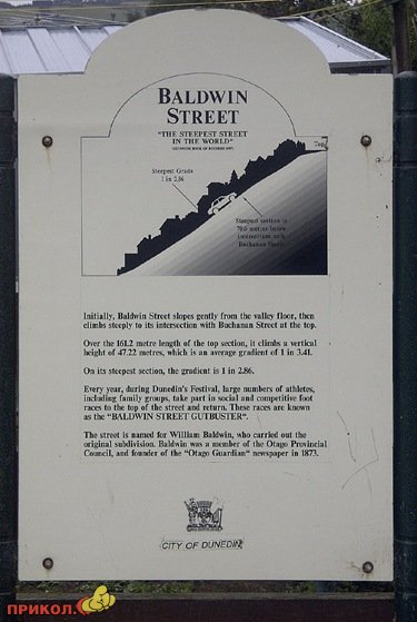 Тихая пригородная улица Baldwin Street в Новой Зеландии в южном городе Dunedin — самая крутая улица в мире. Максимальный ее наклон — 1:2.86 (20 ° или 38 %), это похоже на то, как если бы проехав каждые 2, 86 метра горизонтально вам пришлось подскочить на 1 метр.