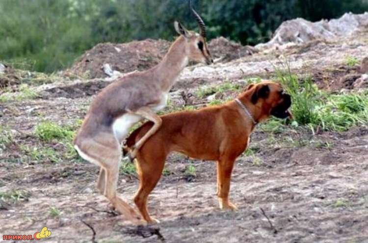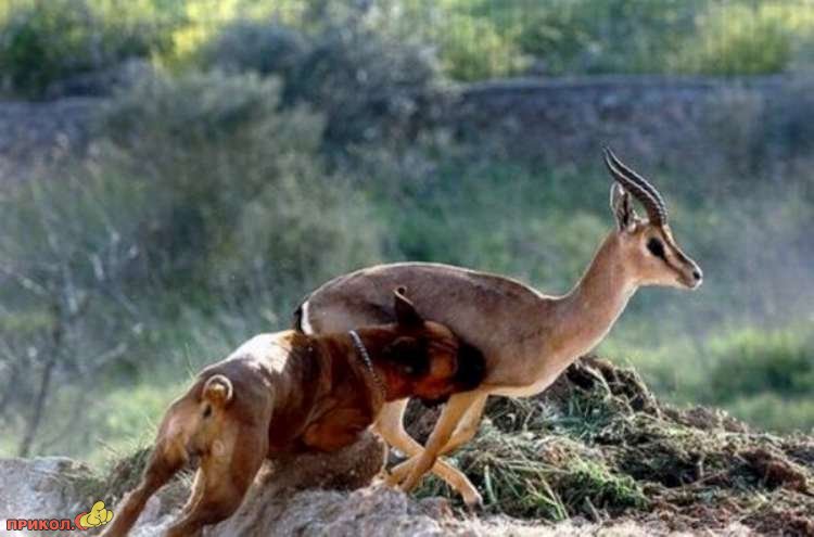 та здеся надо было фотки местами поменять, зачем всяково сочинять? дружат же кошки с собаками, вот и этот тупой «алень-косуль-зебр-кенгуру» захотел подружить собачку и получил по рогам)))
