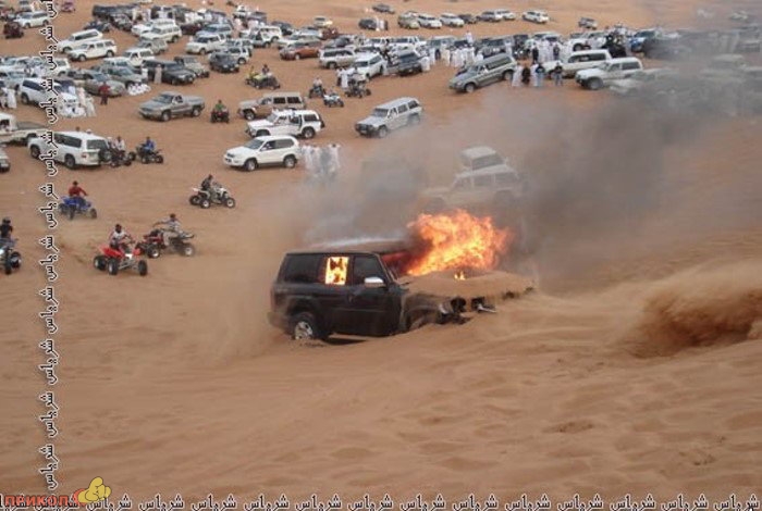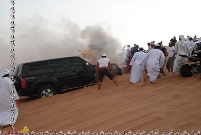 Не глупые ребята — песком тушили. Вода в пустыне стоит намного дороже этой машины.