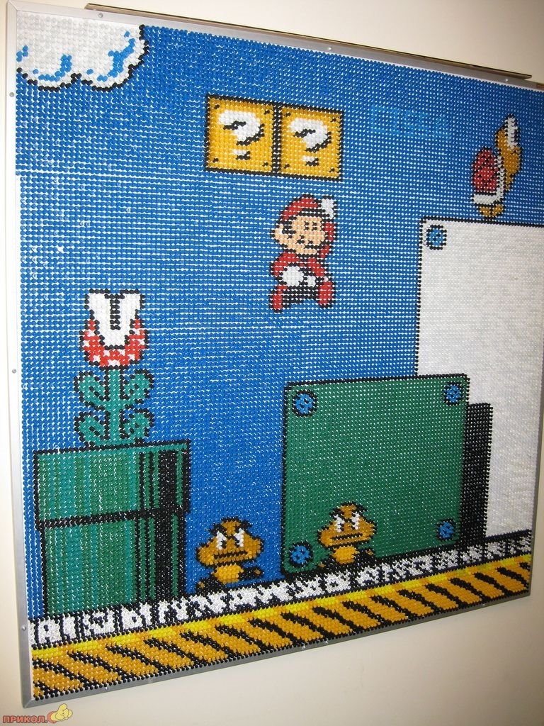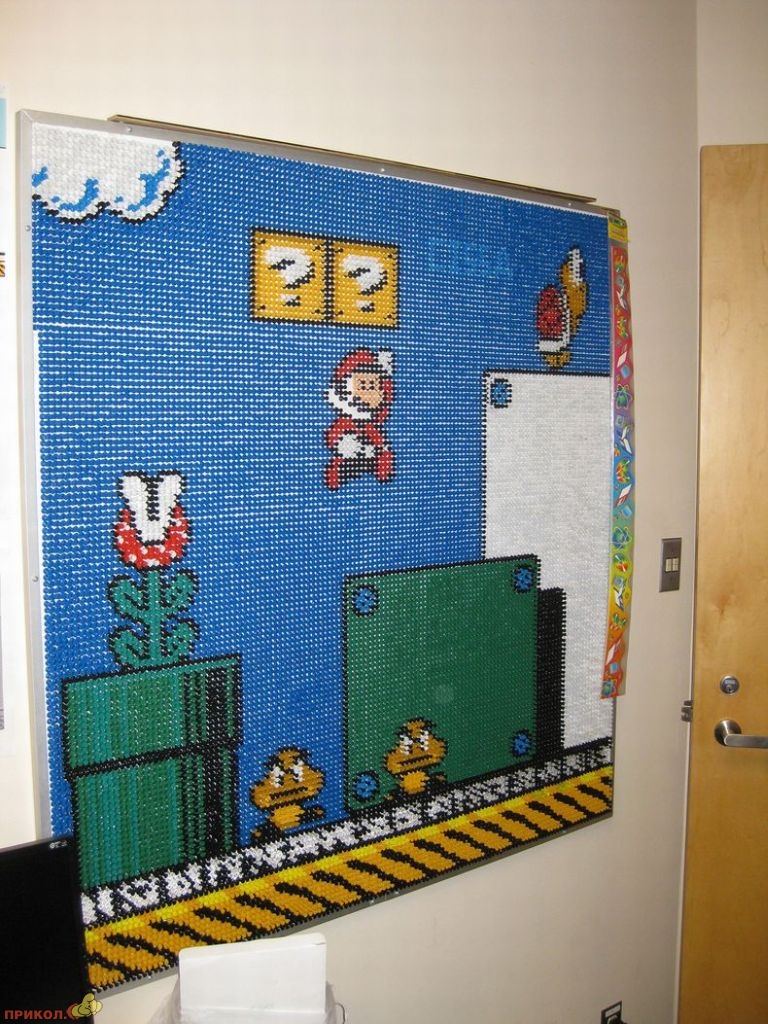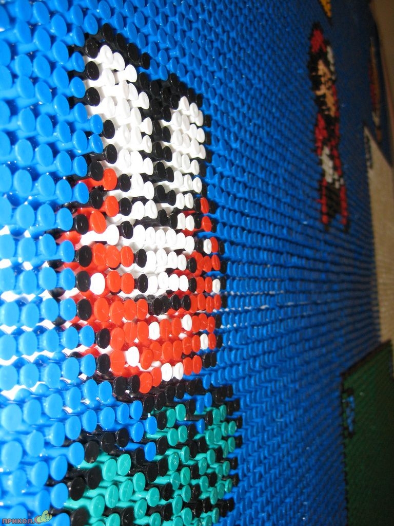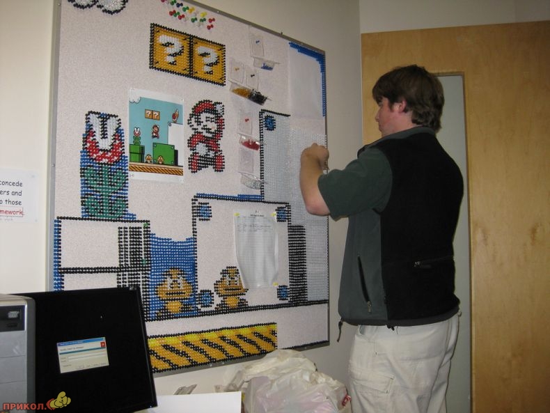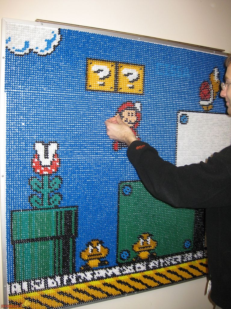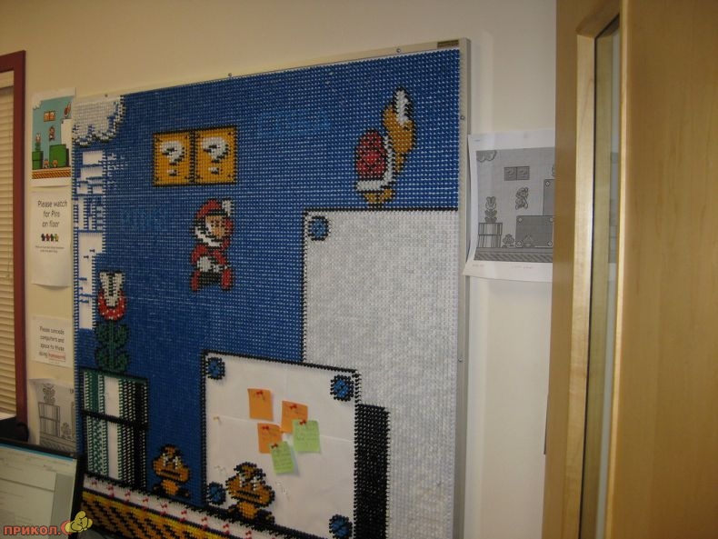 Вот пример еще одного фаната — он «рисует» фрагменты любимой игры цветными канцелярскими кнопками. Получается здорово.