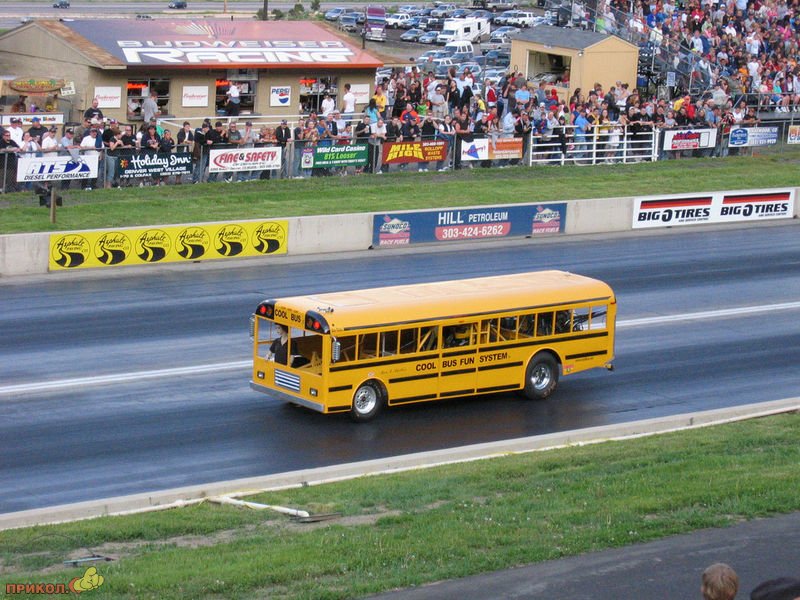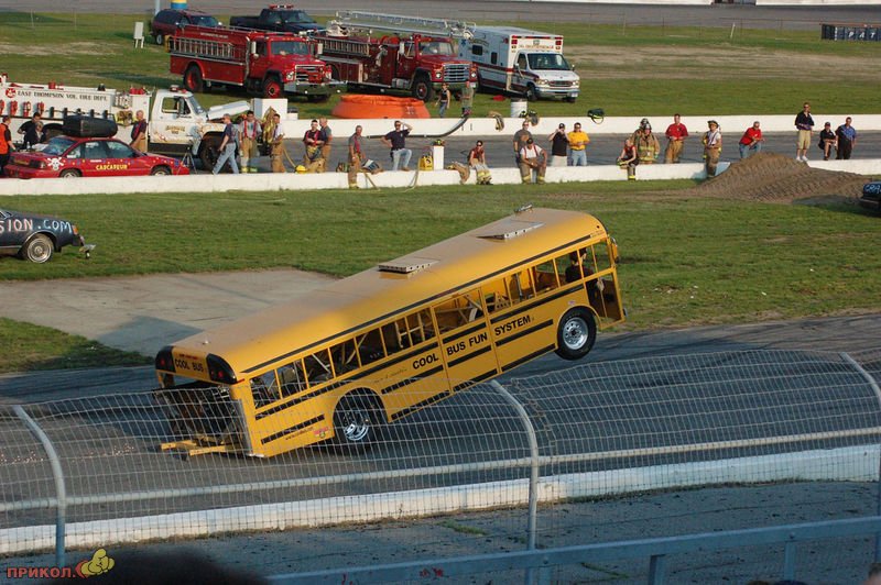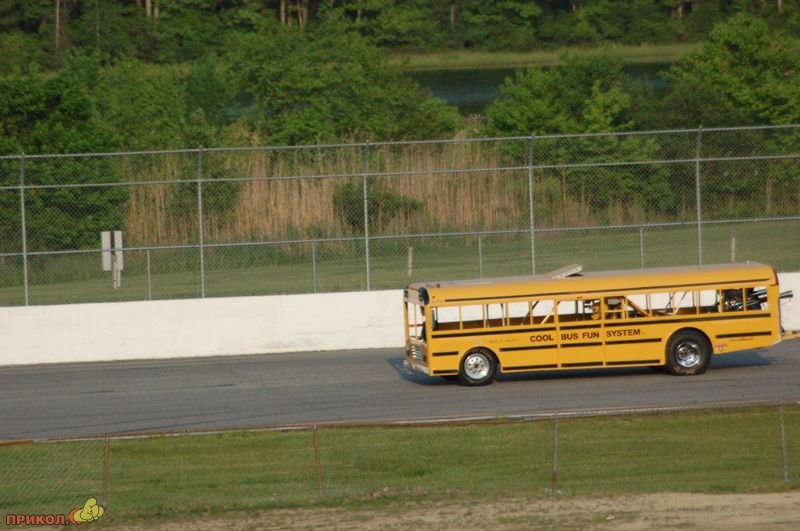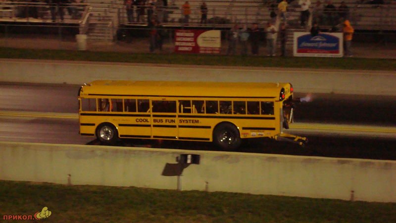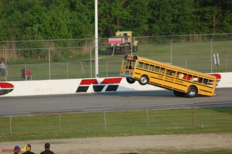 Уникальный драг-рейсерский школьный автобус Кена Нелсона потерпел крушение в недавнем заезде. Автобус был выполнен из алюминия и оборудован 1000-сильным тюнингованным двигателем Шевроле, смонтированным сзади. Кен отделался легким испугом и к прибытию спасателей уже вылез из автобуса.