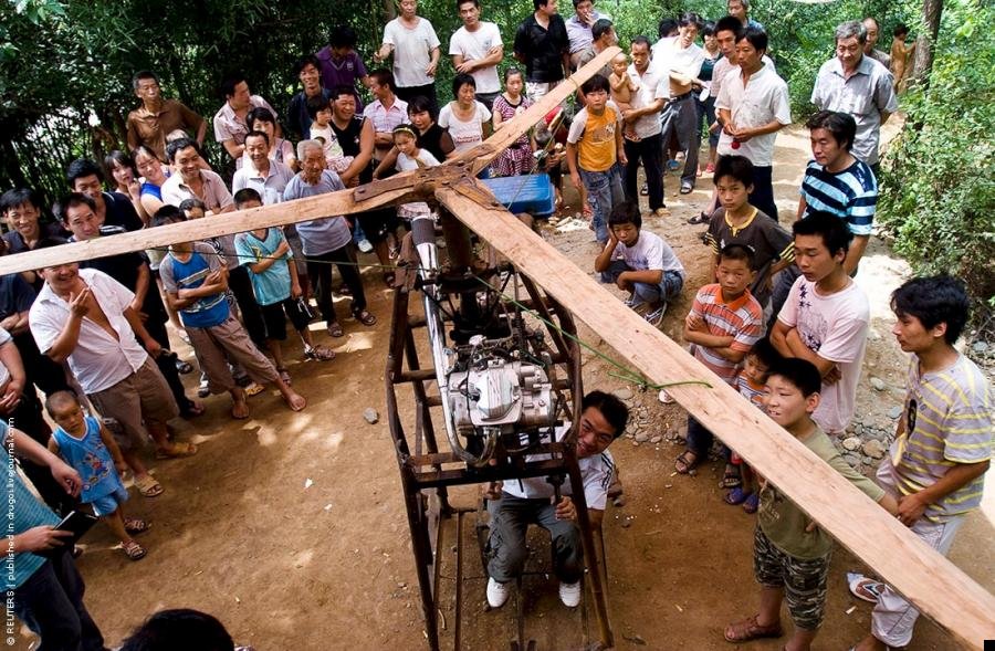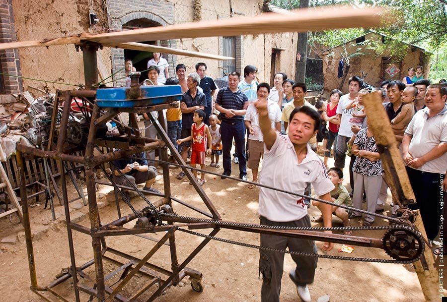 22-летний китайский крестьянин из подручных средств собрал вертолет собственной конструкции. Местная полиция уже запретила юноше отрываться от земли, так что пока неизвестно может ли летать эта железяка. К слову, аппарат приводится в действие двигателем от мотоцикла объемом 150 кубических сантиметров.