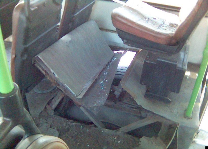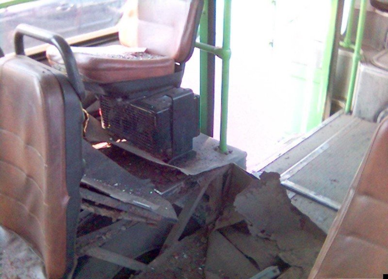 Автобус стоял на конечной остановке, когда у него взорвалось заднее колесо. Посмотрите, как разворотило салон. Жуть какая. Хорошо что пассажиров внутри не было.