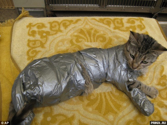 На одной из улиц Филадельфии женщина обнаружила сверток, который оказался кошкой, завернутой от ушей и до хвоста в прочную клейкую ленту. Прибывшие на место сотрудники службы по защите животных были шокированы. Это один из самых странных случаев проявления жестокости по отношению к животным, с которыми им когда-либо приходилось встречаться.