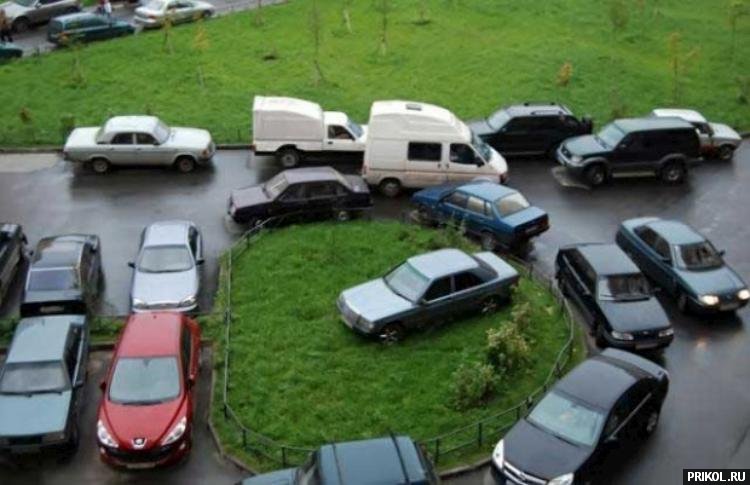Кто-то оставил на ночь машину, загородив проезд. Приехавший эвакуатор решил проучить несознательного гражданина. Машина была перемещена на огороженный заборчиком газон. Не знаю как владелец потом её оттуда доставал :)