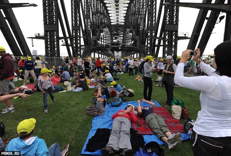 25 октября в Сиднее на мосту Харбор-бридж собрались шесть тысяч австралийцев для того чтобы позавтракать. Этот мост, имеющий восемь полос для движения автотранспорта, очень загруженный в рабочие дни, в это воскресенье был полностью перекрыт на два часа и застелен натуральным травяным покрытием. Принять участие в гигантском пикнике, проходящем в рамках сиднейского фестиваля еды, выразили желание 45 тысяч австралийцев, но получить билет посчастливилось только шести тысячам.