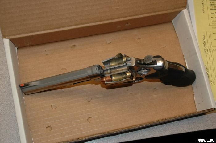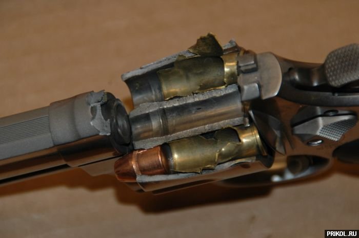 Насчет явной дешевки — не факт. Револьвер на фото — Смит и Вессон. По эмблеме видно. Может, и китайская подделка, но вряд ли. Револьверы этой фирмы производятся в США, в Спрингфилд Комплекс, и ценятся как раз за надежность и качество стали. Это, кстати, к вопросу о том, частенько ли это случается, что механизм не сработал, и пулю заклинило. И, кстати, это НЕ газовый револьвер, не похоже. На всех фото видна пуля, пуля оболочечная, CMJ (complete metal jacket). А вот где амуниция произведена — об этом история умалчивает. Гильза латунная, не стальная, но, не видя маркировки на донышке гильзы, не скажешь, где произведена. При выстреле разорвало патрон, может, слишком большой пороховой заряд, некачественный порох.