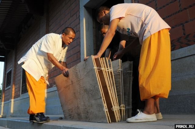 Шаолиньский монах Shi Liliang использует фанерные доски толщиной полсантиметра для отработки трюка «бег по воде».