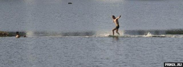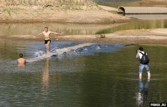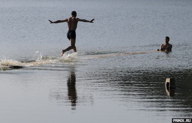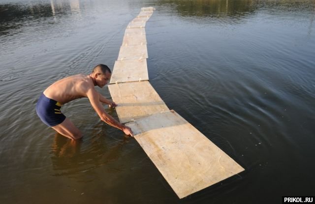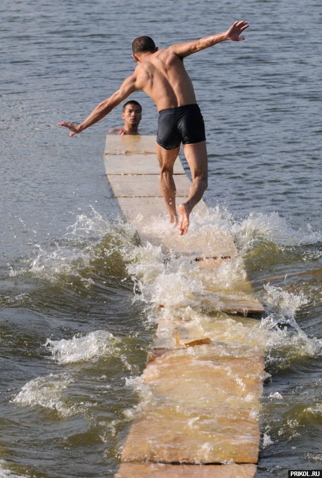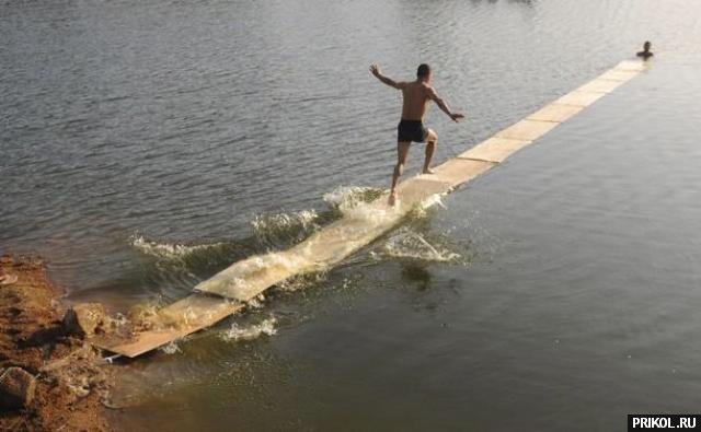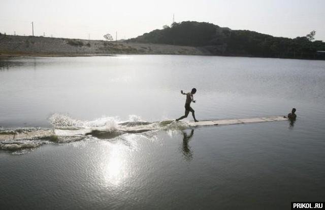 Фанера, плавающая на поверхности озера, образует «беговую дорожку» длиной 15 метров. Задача — пробежать по ней до конца. :)