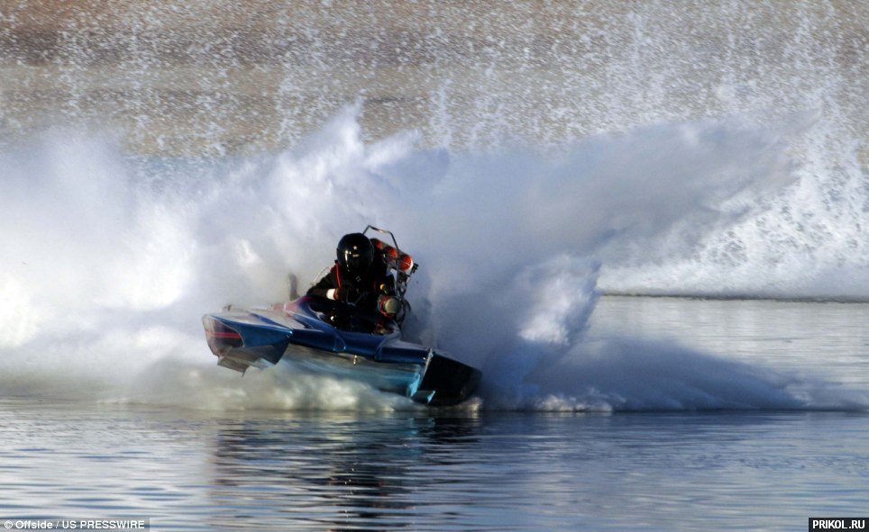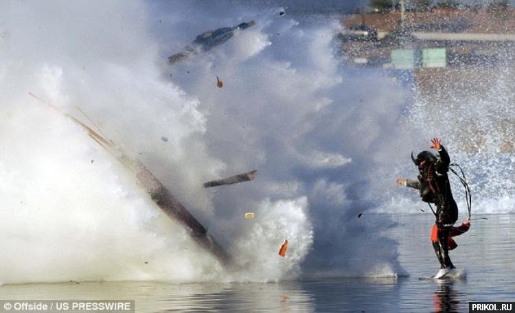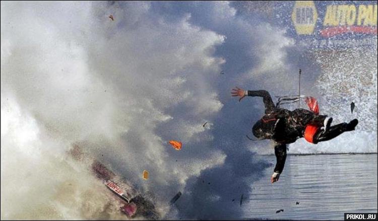 В американском штате Аризона во время гонок взорвался гидроплан на скорости 240 км/ч. Гонщику, можно сказать, повезло: отделался сломанной ногой. Авария выглядела очень эффектно.