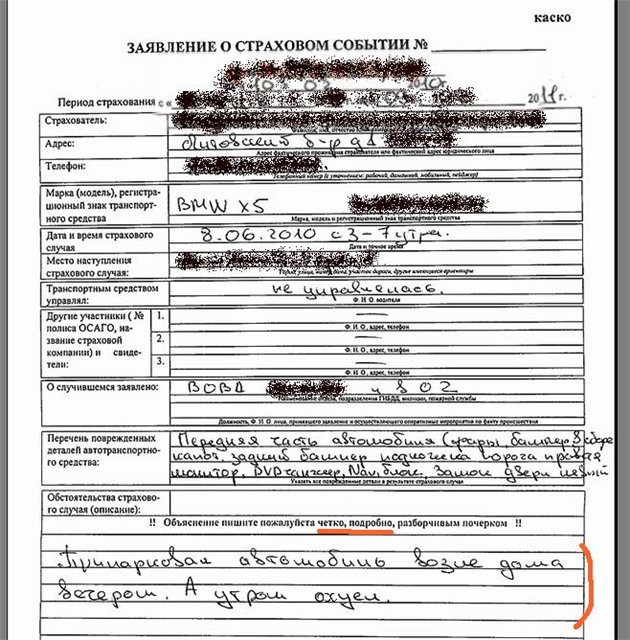 Автомобиль застрахован и владелец должен написать в свою страховую заявление