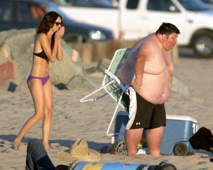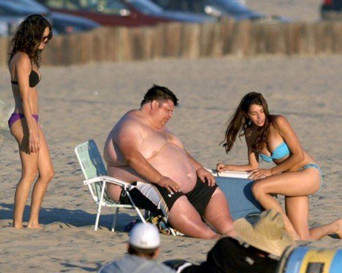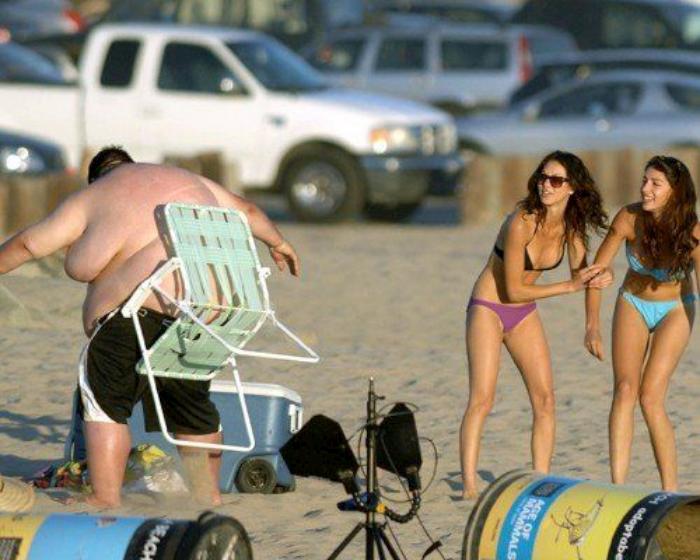 Забавная сценка на пляже — две девушки помогают толстому парню встать с кресла.