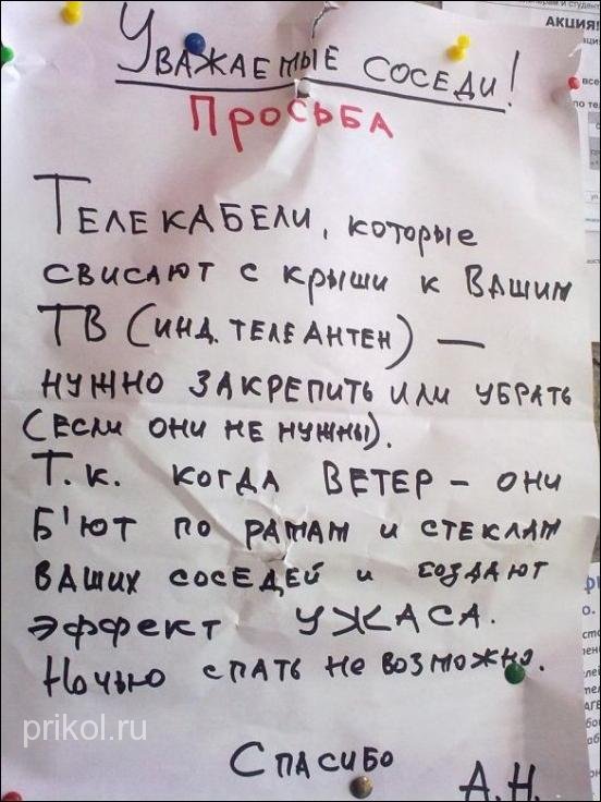 А про телекабели — реально страшновато по ночам! :shock: У нас в доме у многих они свисают и в том числе у моих соседей сверху! Надо тоже такие-же объявления развесить!!! :lol: :lol: :lol: