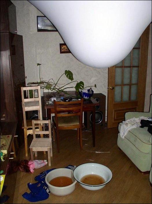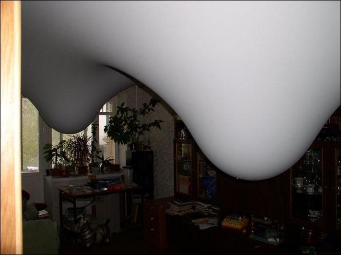 Всем привет! Я хозяйка этого потолка. И автор фотографий, кстати. Хотелось бы на самом деле упоминания обо мне :) Событие это случилось осенью 2003 года и фото скопированы с моего аккаунта на фотофайле. Поправлю: 1) потолки немецкие 2) прокалывать их иголкой ни в коем случае нельзя, будет что-то типа взрыва. Для того, чтобы вылить, приезжает организация их установившая, снимает со стены крепеж и за скромную плату ковшиком воду вычерпывает. На самом деле прикольно — столько лет эти фотки по инету гуляют. На досуге могу сфоткать: и мебель в квартире поменялась, а потолок все стоит (или висит? :))