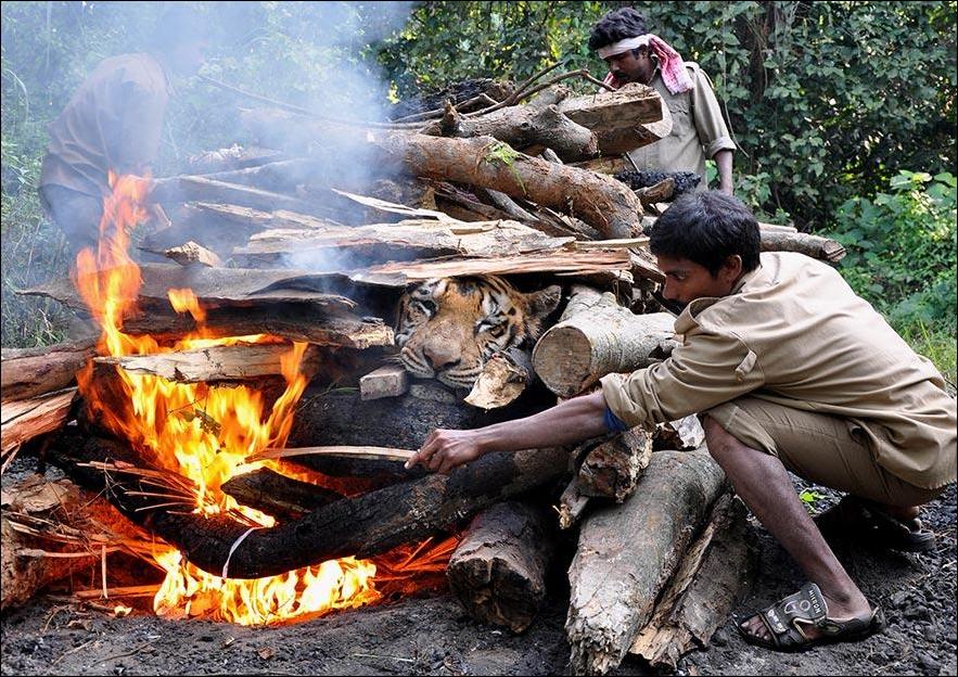 Тигр умер своей смертью, от старости. Звали его Анируддха, а в индийской мифологии так же звали внука бога Кришны. Из уважения животное кремировали по индуистскому обычаю как человека. На фото этот ритуал совершают сотрудники зоопарка, где жил этот тигр.