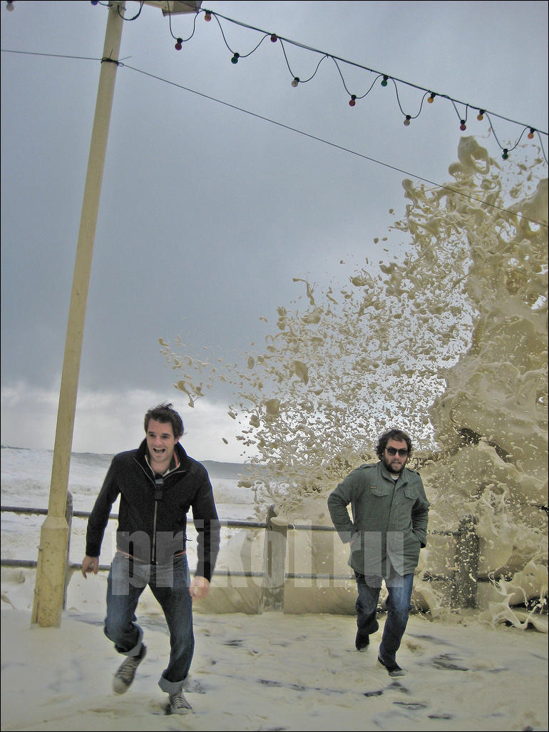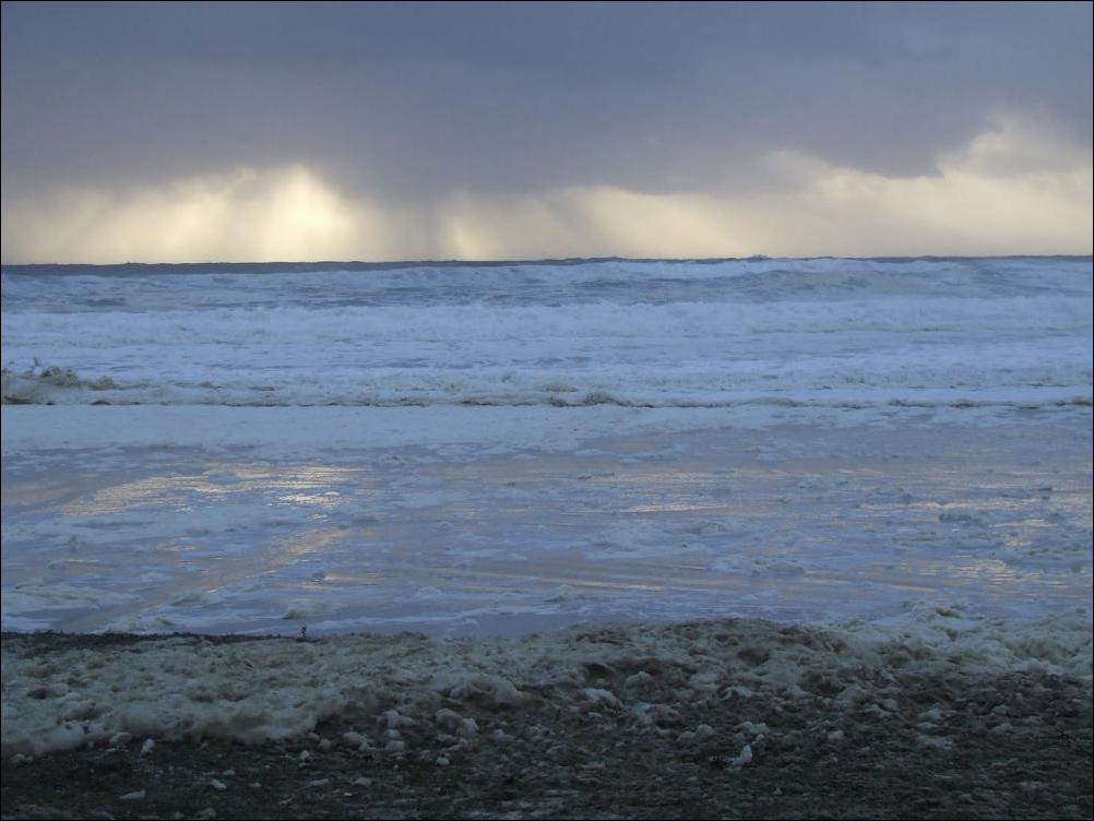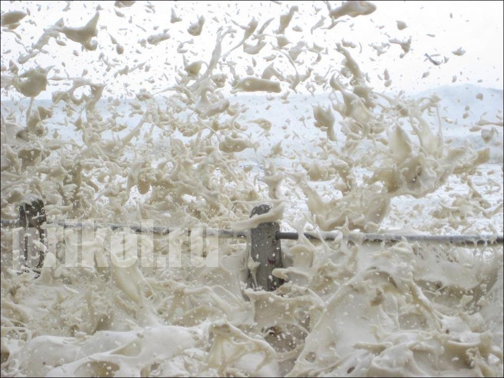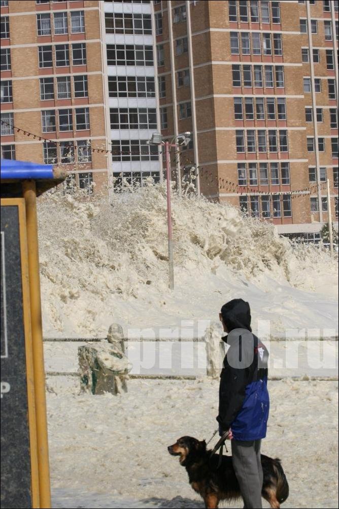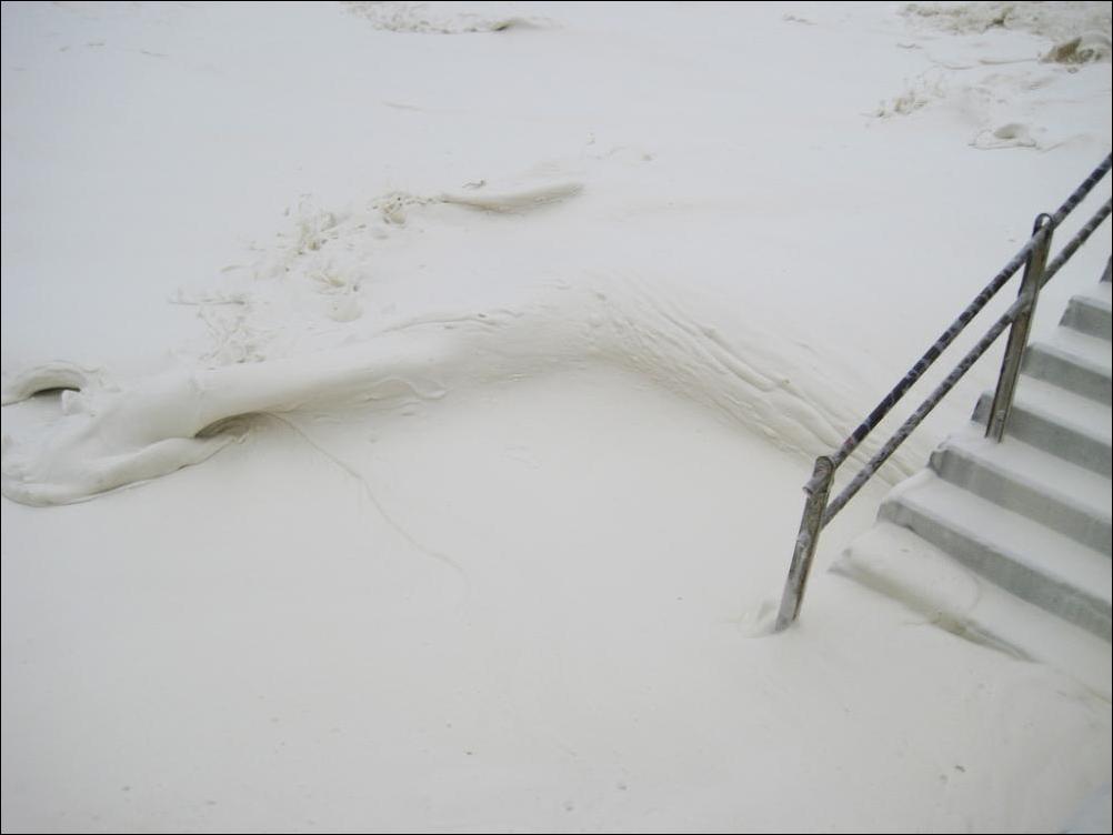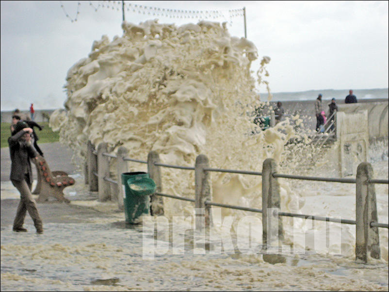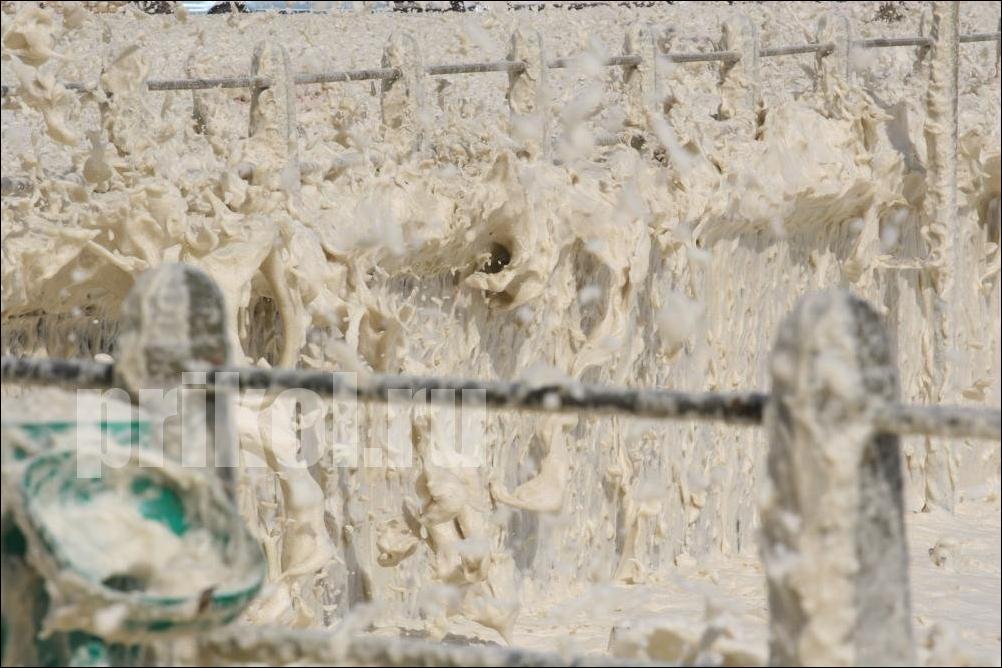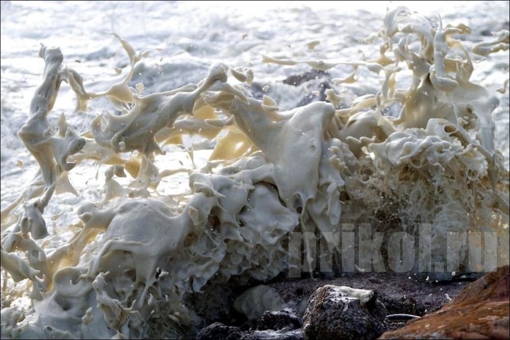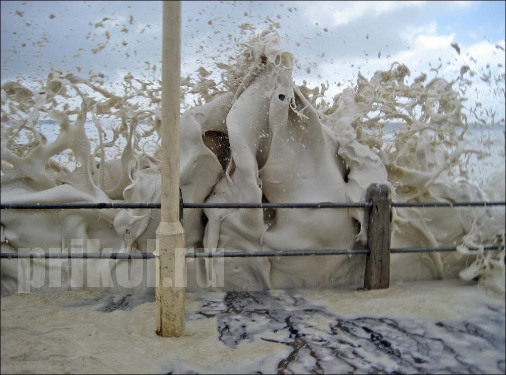 Если серьёзно, то эта пена образуется из различных примесей, содержащихся в морской воде — всяких солей, химикатов, разложившихся рыб и выделений всякой морской живности. Всё это перемешивается мощными подводными течениями, и образуются пузырьки. Они соединяются, и получается как раз такая пена. :smile: