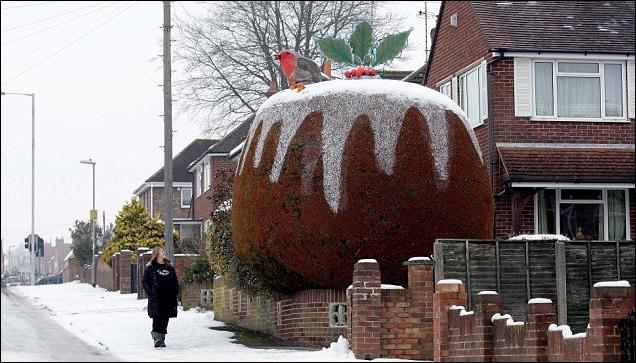 Ну нравится местным жителям это… Тем более, что под «пудинг» кусты украшают только на Рождество. Малиновку сделали только в этом году из мячиков, коврика и стекловолокна.