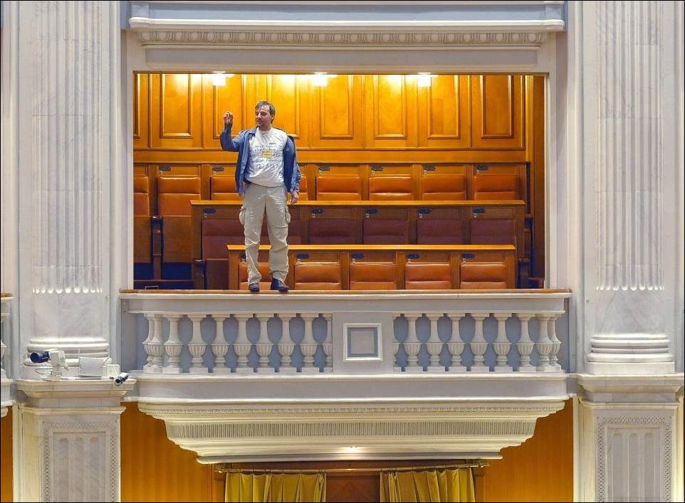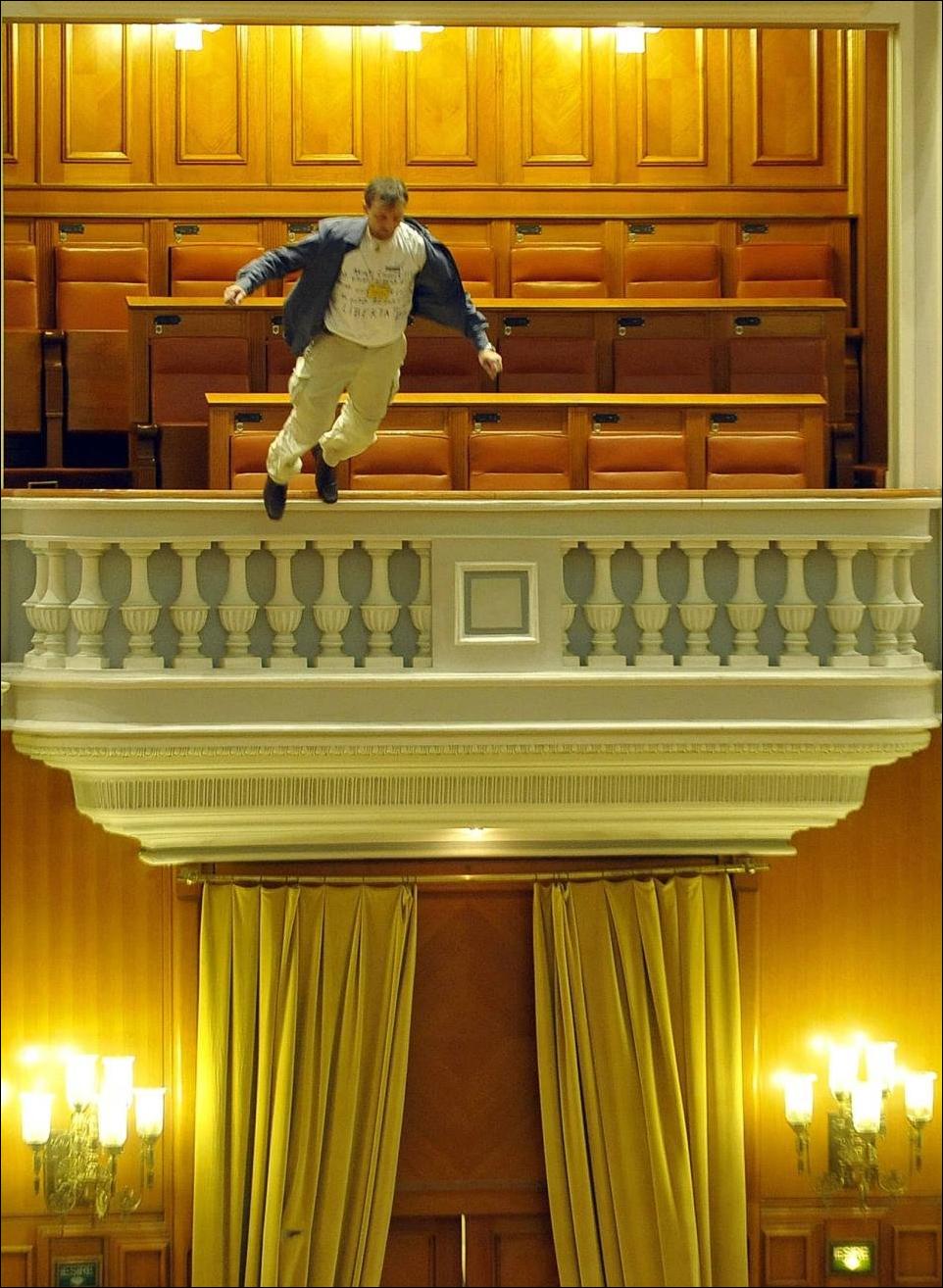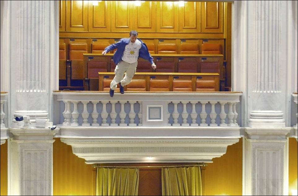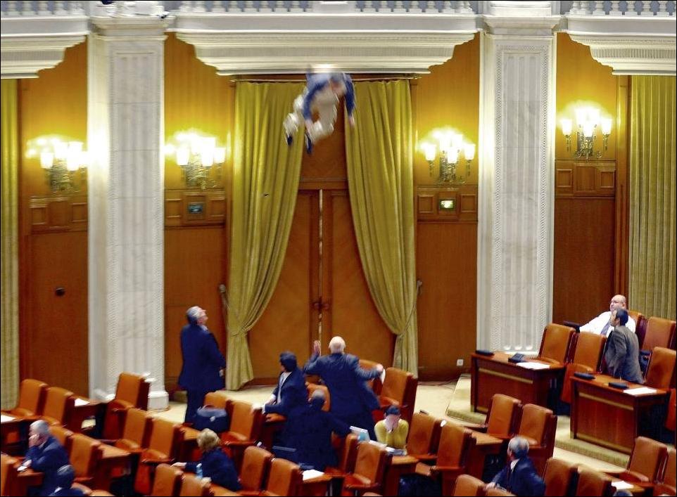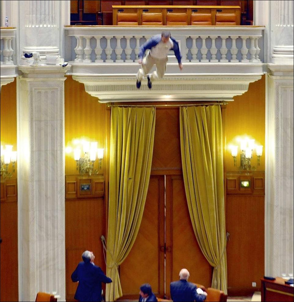 Депутаты румынского парламента прервали свою работу после того как сотрудник местной телекомпании спрыгнул с балкона в зал заседаний.