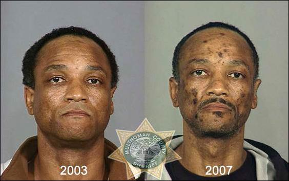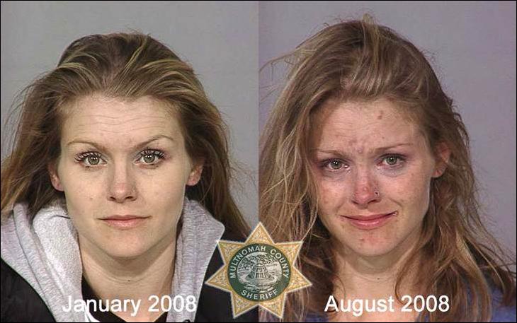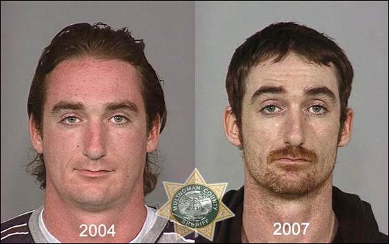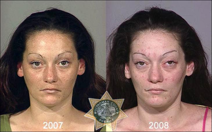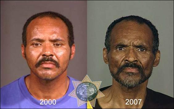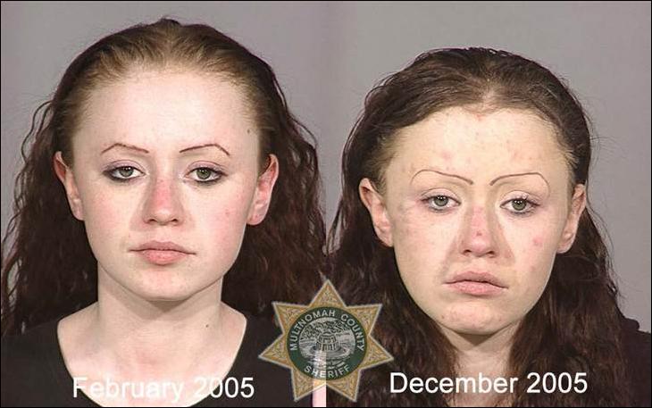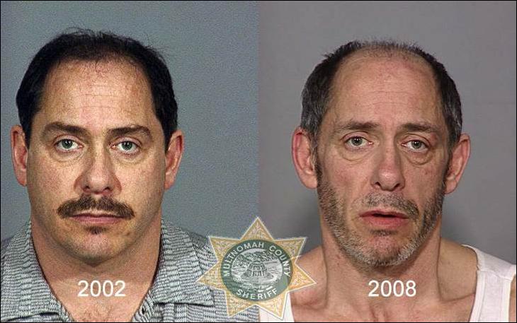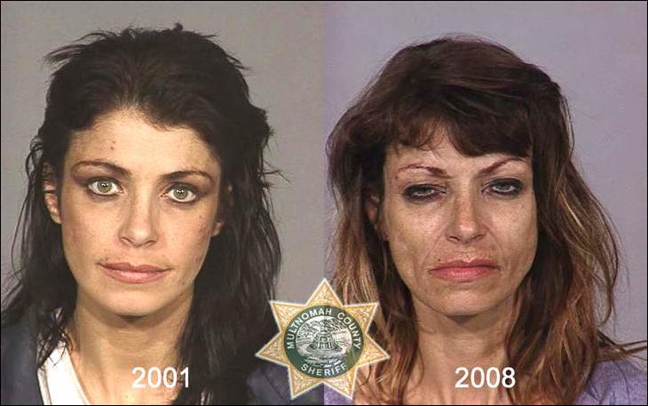 Фото слева сделано в день первого попадания наркомана в полицейский участок, фото справа — через несколько лет, когда наркоман снова угодил в полицию.