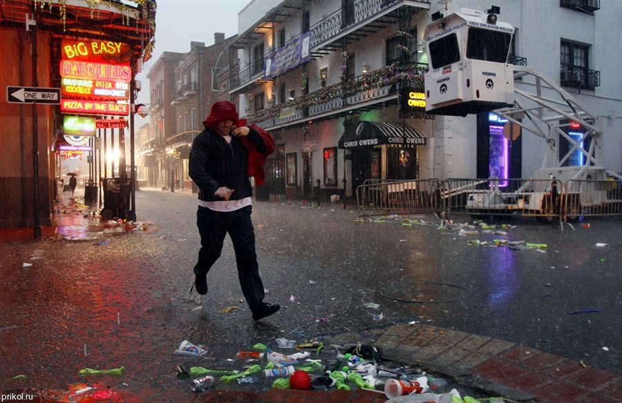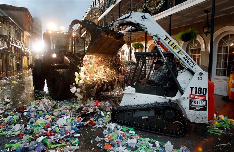 Утром 9 марта на Бурбон-стрит во французском квартале Нового Орлеана погрузчик собирает то, что осталось после праздников :)