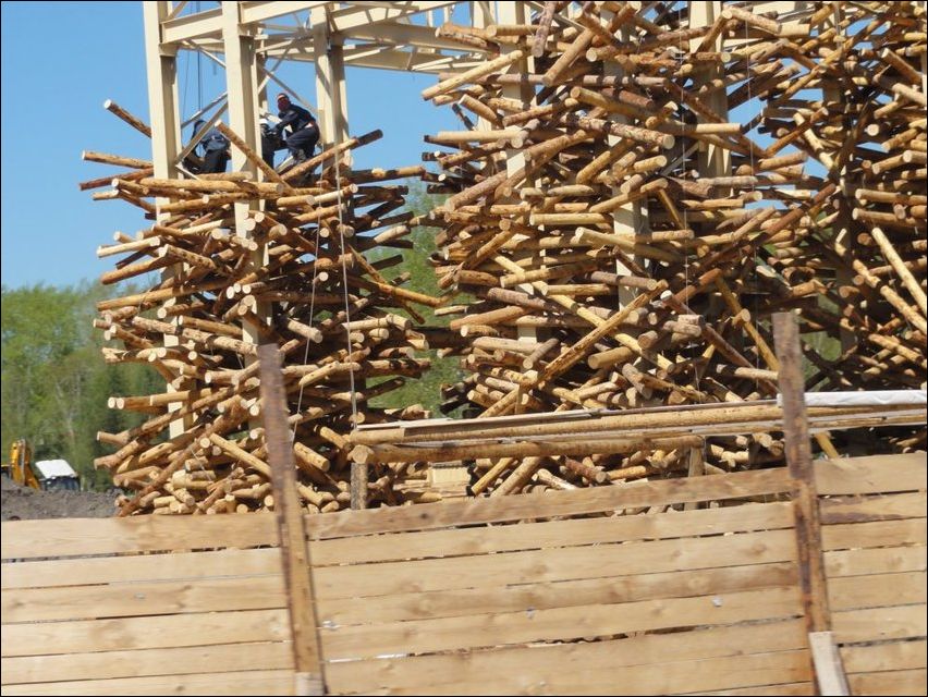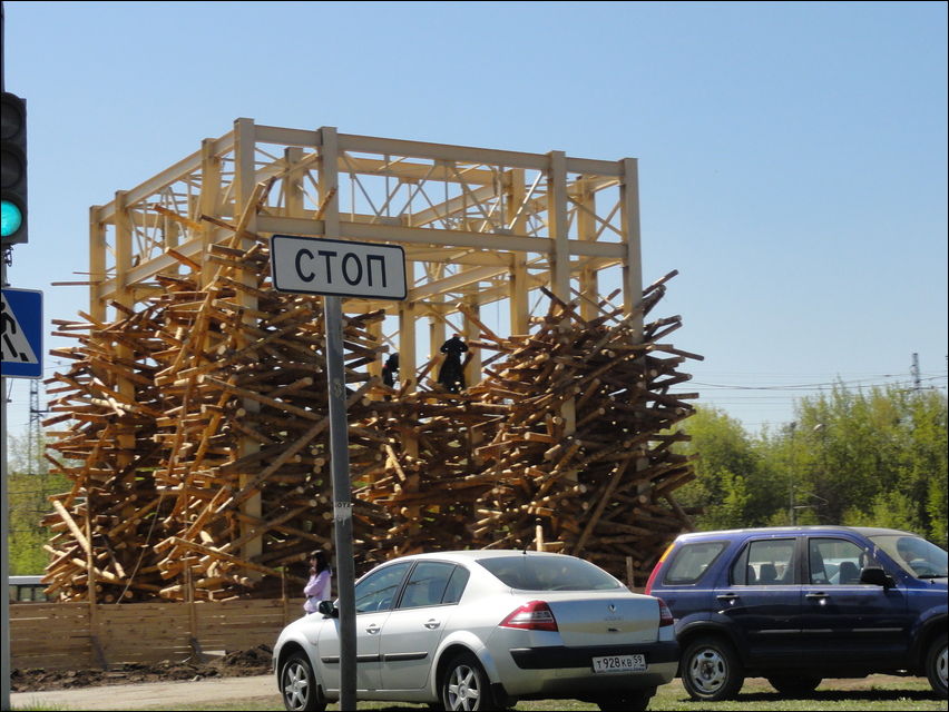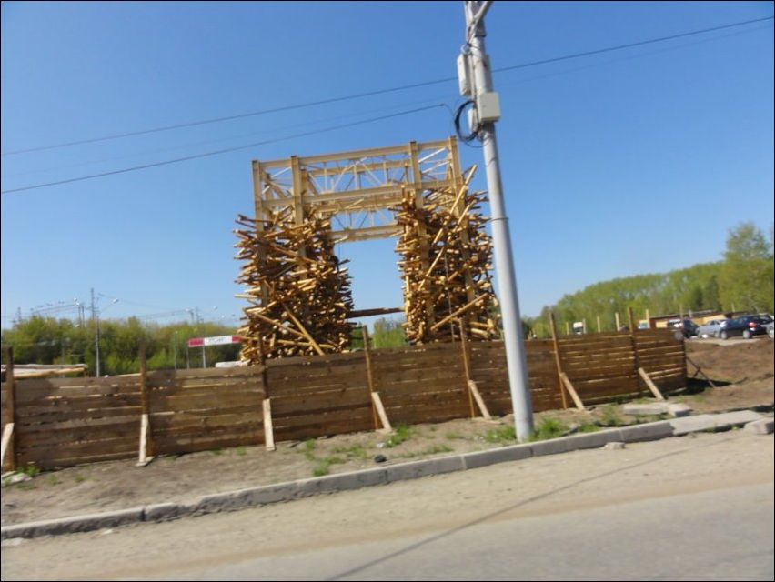 Это будет 12-метровая деревянная арка,или новые «Пермские ворота». Автор сего творения — художник Николай Полисский. Кроме визуального эффекта, внутри «ворот» будет аудиоинсталляция — из колонок, спрятанных в деревянной «арке» будут доноситься звуки природы. А по ночам объект будет подсвечиваться. Так что screen и Кисулька правы. :)