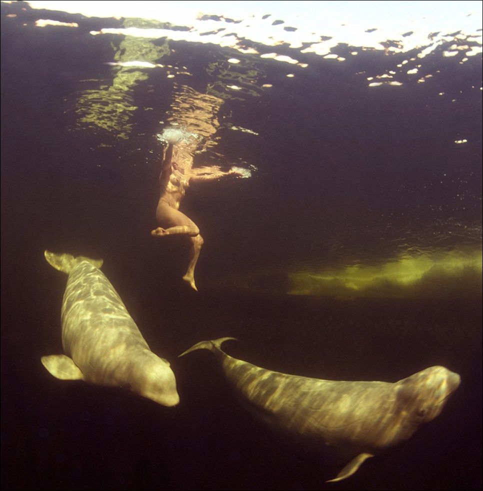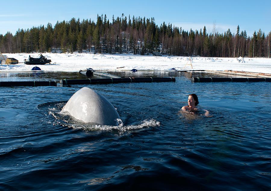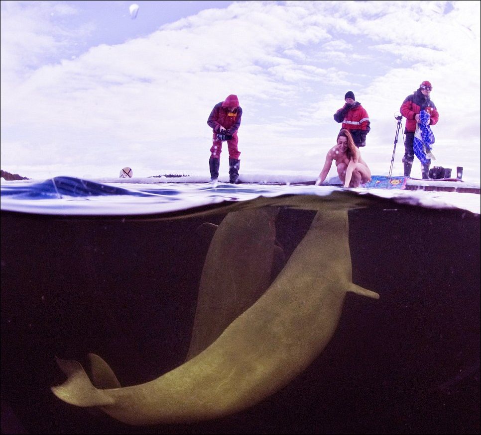 без гидрокостюма, плавая в компании белух.
