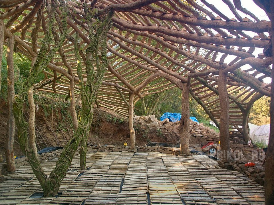 Непривычно… и внутри выглядит ненадежно. Что-то среднее между шалашом и юртой. Если все это не обвалится, то жить можно какое-то время, раз больше негде. Лучше, чем под открытым небом. Хотя, наверное, этот домик построили для отдыха, дышится там лучше, чем в городе, на природе хорошо! Не дом, а сказка! :smile: