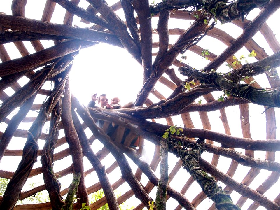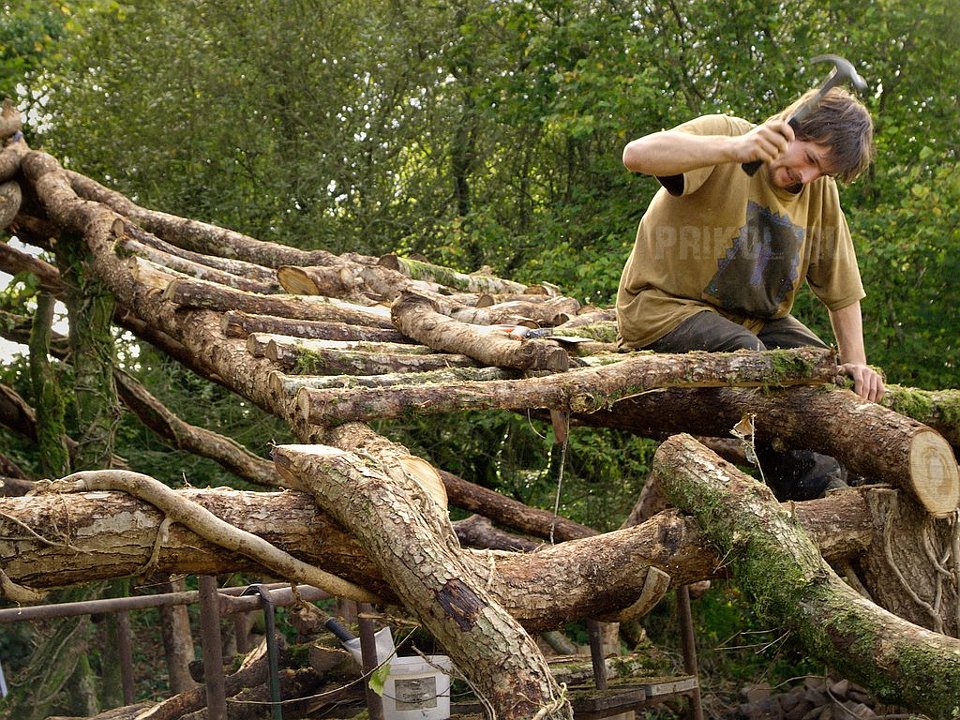 Восхищаюсь фантазией и упорством строителей-выдумщиков! Заметил, что всё сделано из стволов и ветвей дуба. Видно по свежей кожуре… Так что за прочность можете не беспокоиться. Когда детки подрастут, то и порядка в доме прибавится. Может и кладовочки-шкафчики-корзинки для вещей прибавятся. Обживутся малость и придумают, где именно, как и из чего их соорудить. Заметно, что в доме ещё не все сделано, например на фасаде, — всё ж продумать надо… И световой люк наверху ещё не совсем доделан…