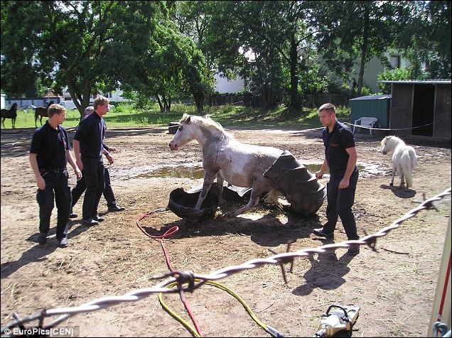 Хозяин этого пони по кличке Смела говорит, что она щипала траву под тракторной покрышкой и подскользнулась.