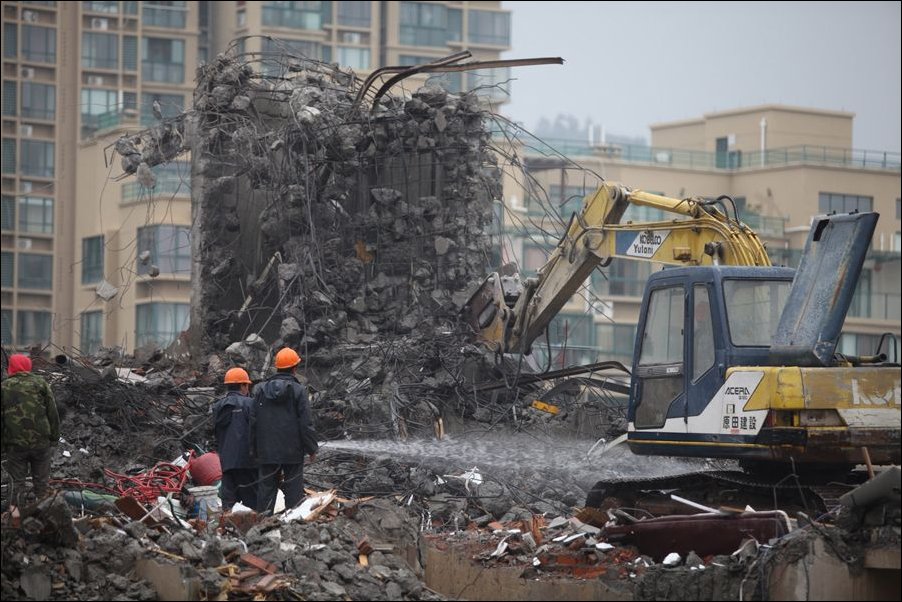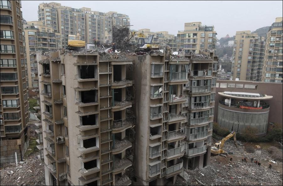 6 декабря 2011. Китайские рабочие сносят жилой дом, построенный меньше года назад.