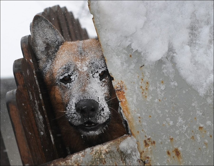 а у меня обе собаки в Вольере живут, так вот у овчарки сегодня как устарого деда брови седые были, -24 утром было :smile: , а на маламуте не было вроде инея. Она правда светлая, мож спросони не заметил.