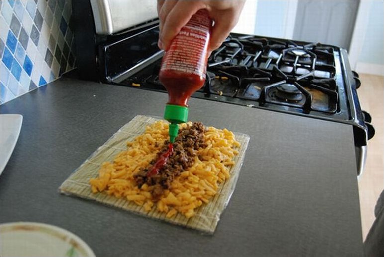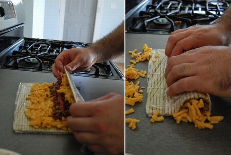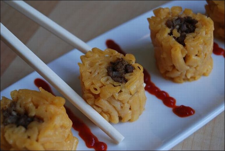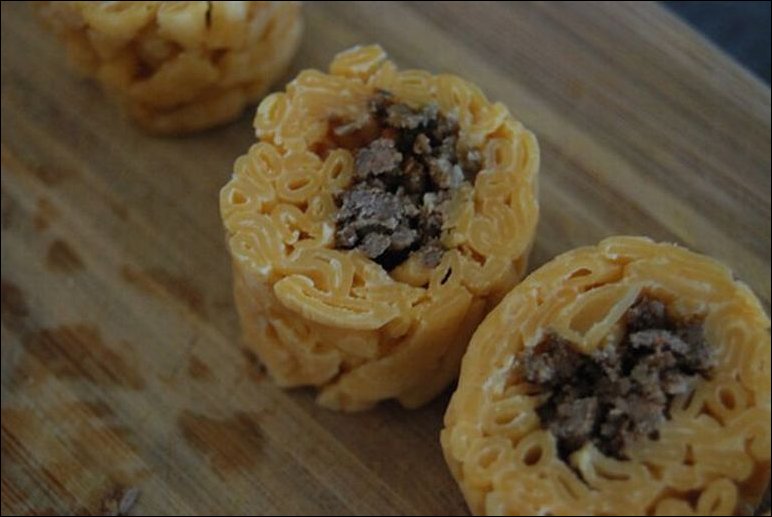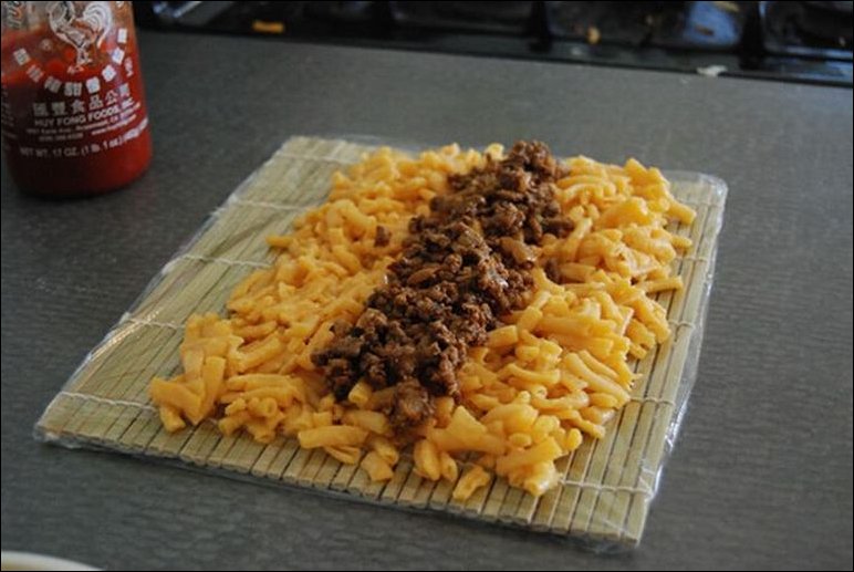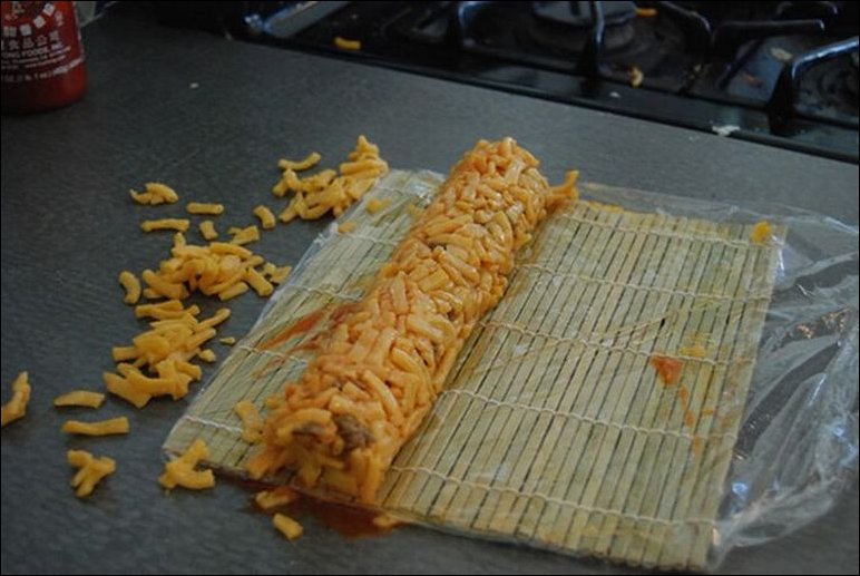 Интересный рецепт приготовления «суши» из макарон с сыром и фаршем :)