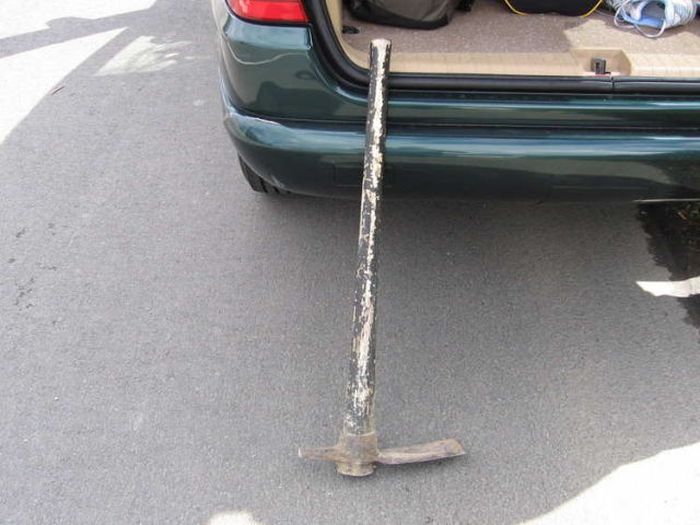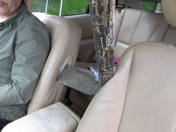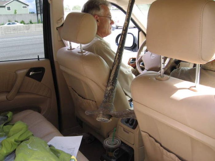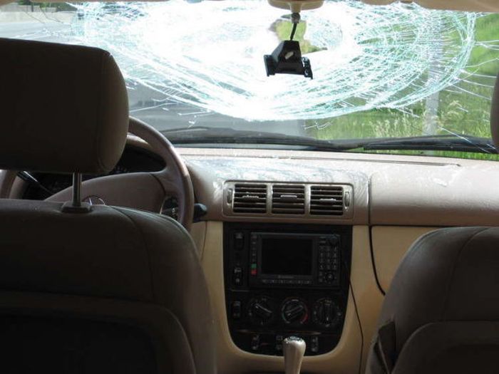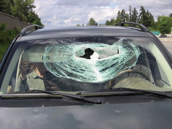 На трассе из пикапа вылетела кирка и попала в салон сзади едущего автомобиля через лобовое стекло аккурат между водителем и пассажиром.