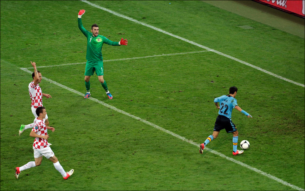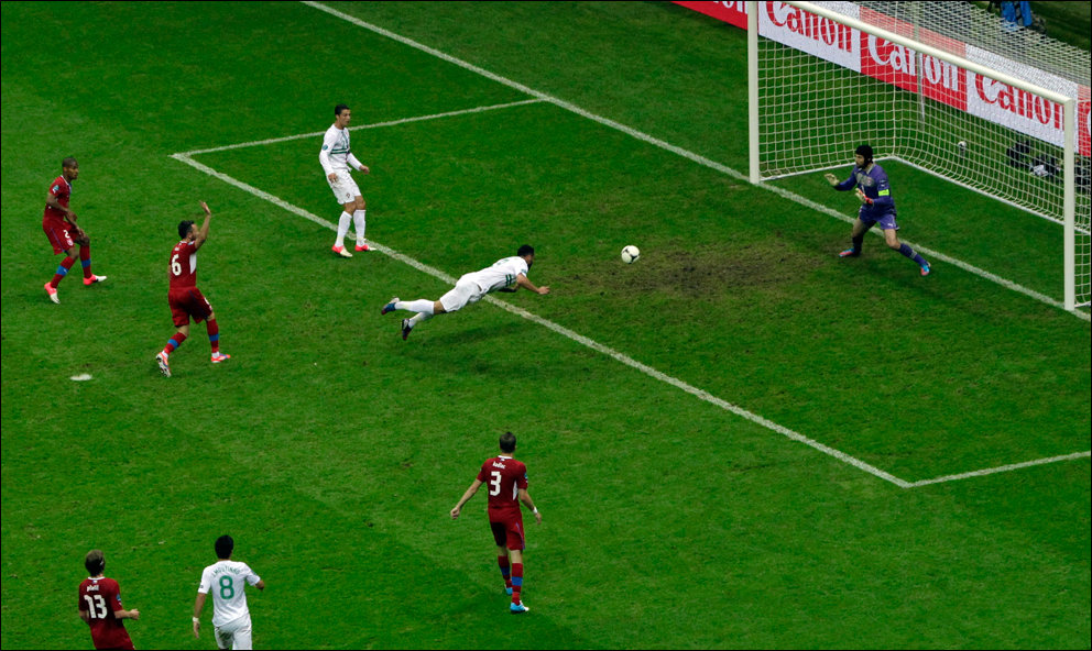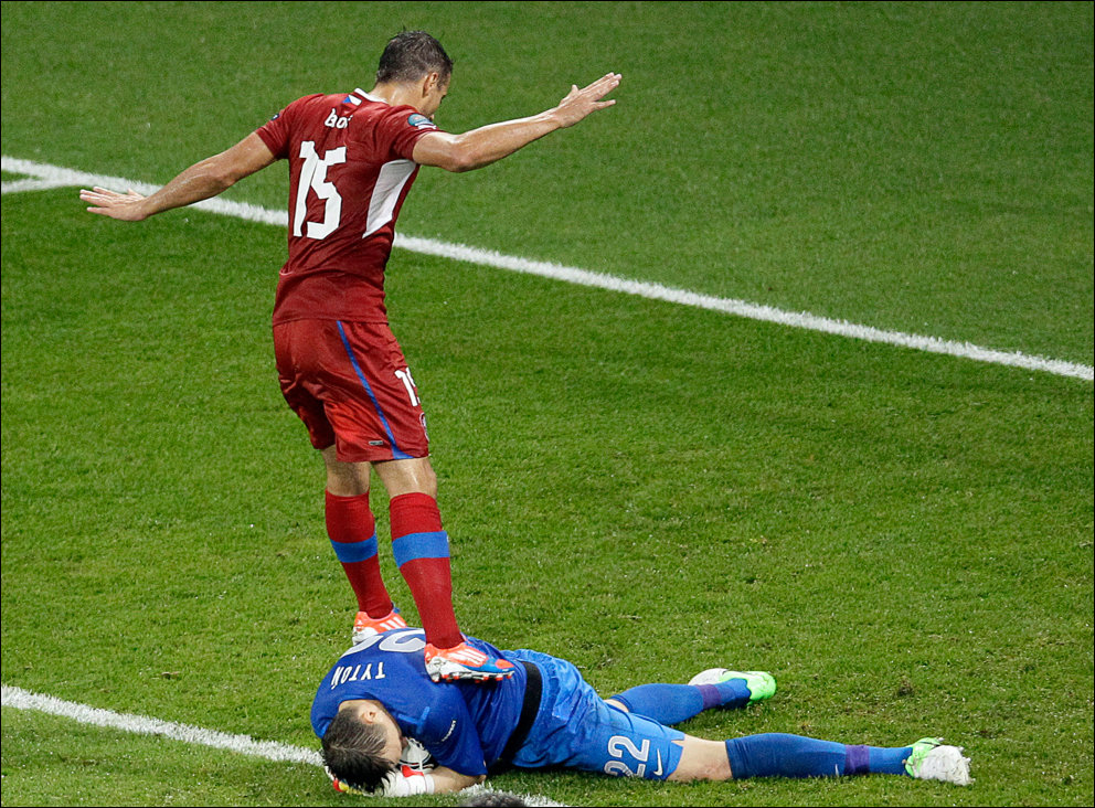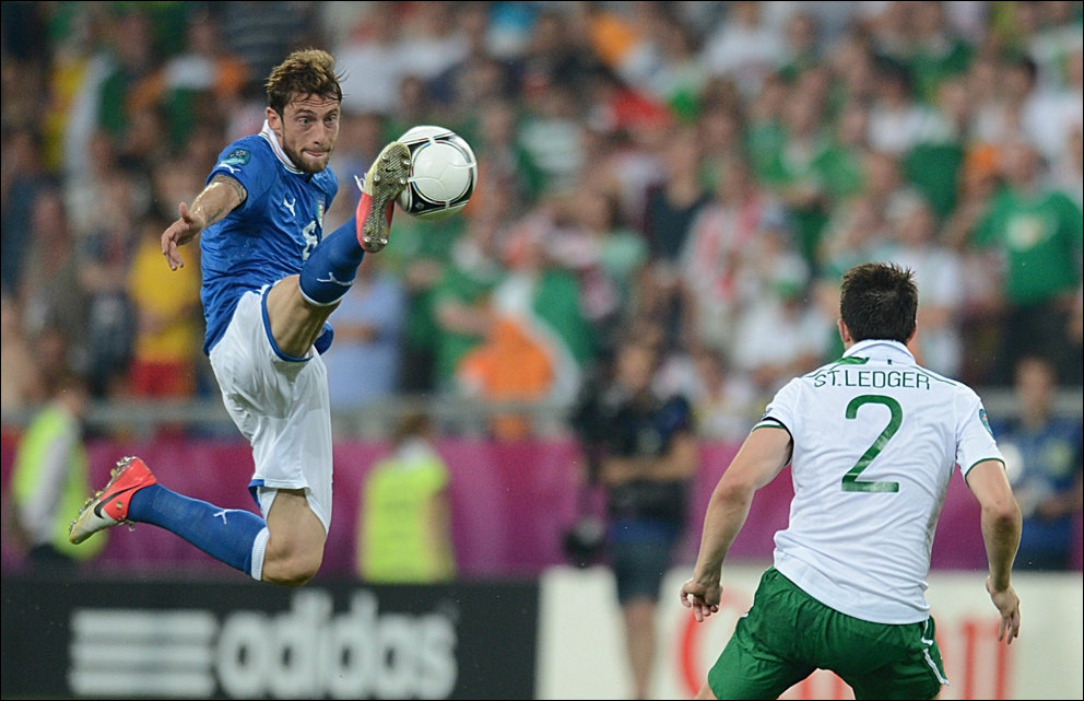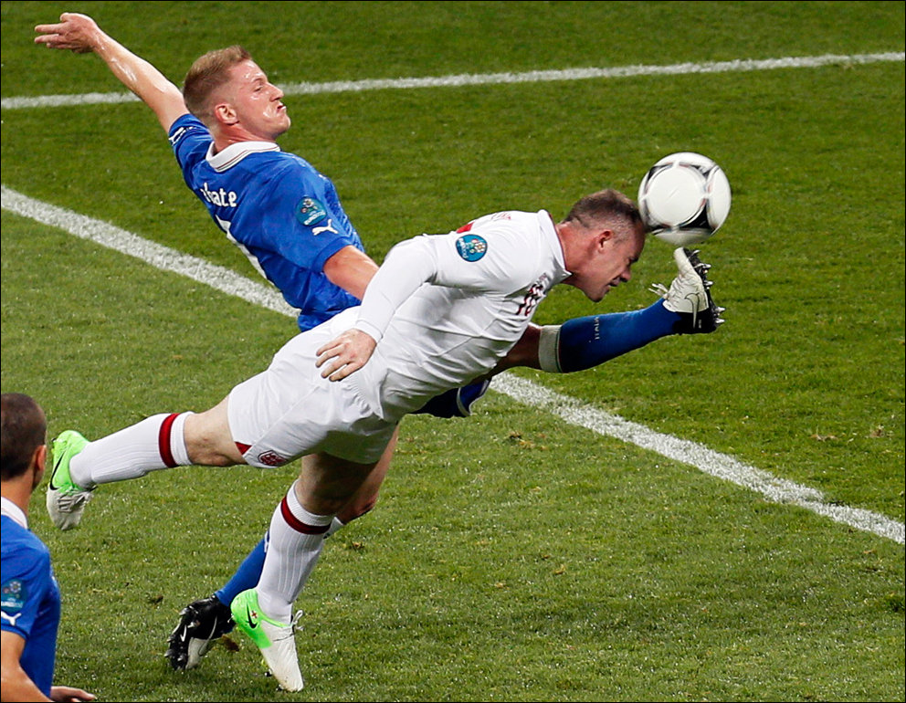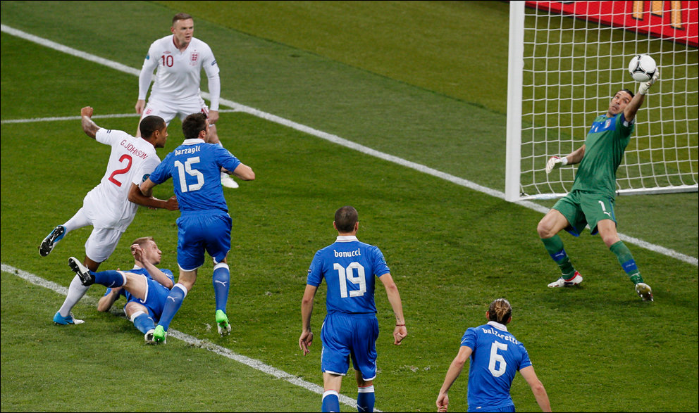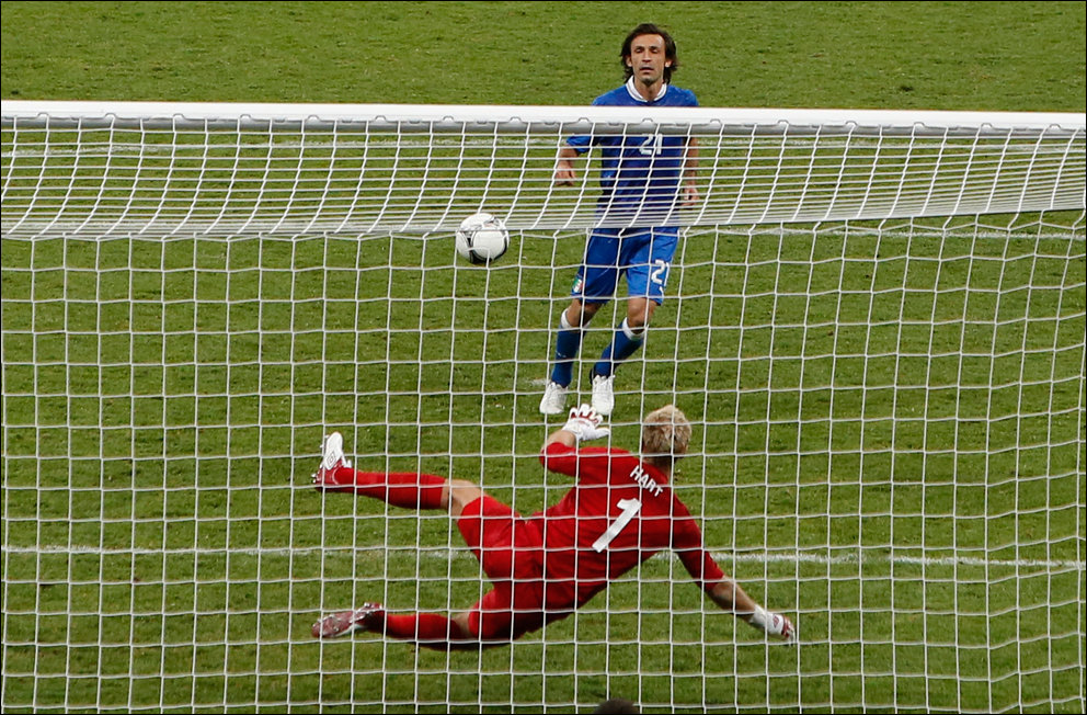 В переводе фраза звучала так: «Де Росси развернулся и кержакнул мяч мимо ворот с шести ярдов».