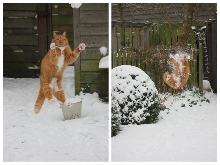 Один дебил подбросил кота, второй запустил снежок, третий дебил сфотографировал