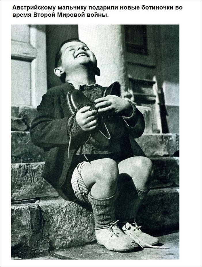 Не передергивайте! Вы посмотрите в чем мальчишка сидит, и с какой искренней радостью прижимает к себе эти ботиночки! И попробуйте сейчас добиться подобных (искренних) эмоций от своих детей!