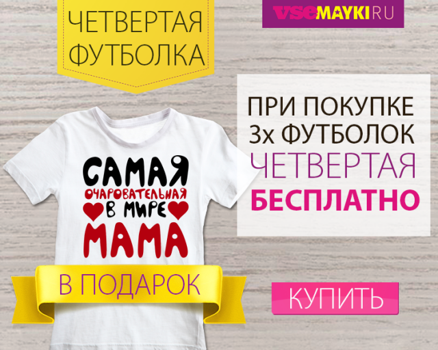 Просто оформи заказ на любые четыре футболки из каталога vsemayki. И одну из них вы получите бесплатно. Промокод вводить НЕ нужно.