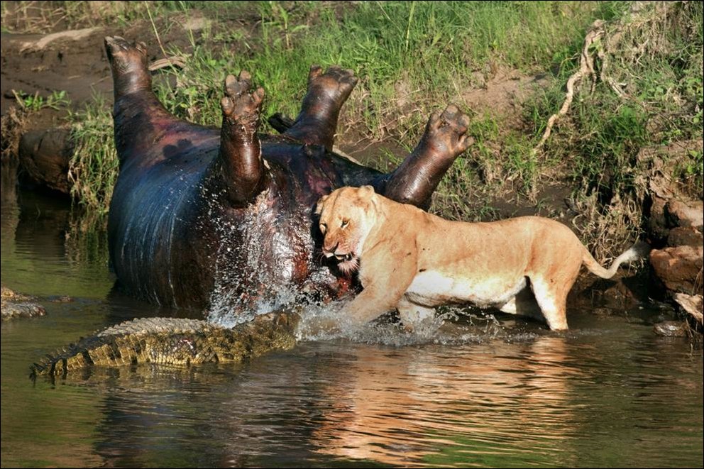 Предметом ссоры стала туша бегемота, умершего по естественным причинам. Туша пролежала несколько часов, пока ее заметили и львы и крокодилы.