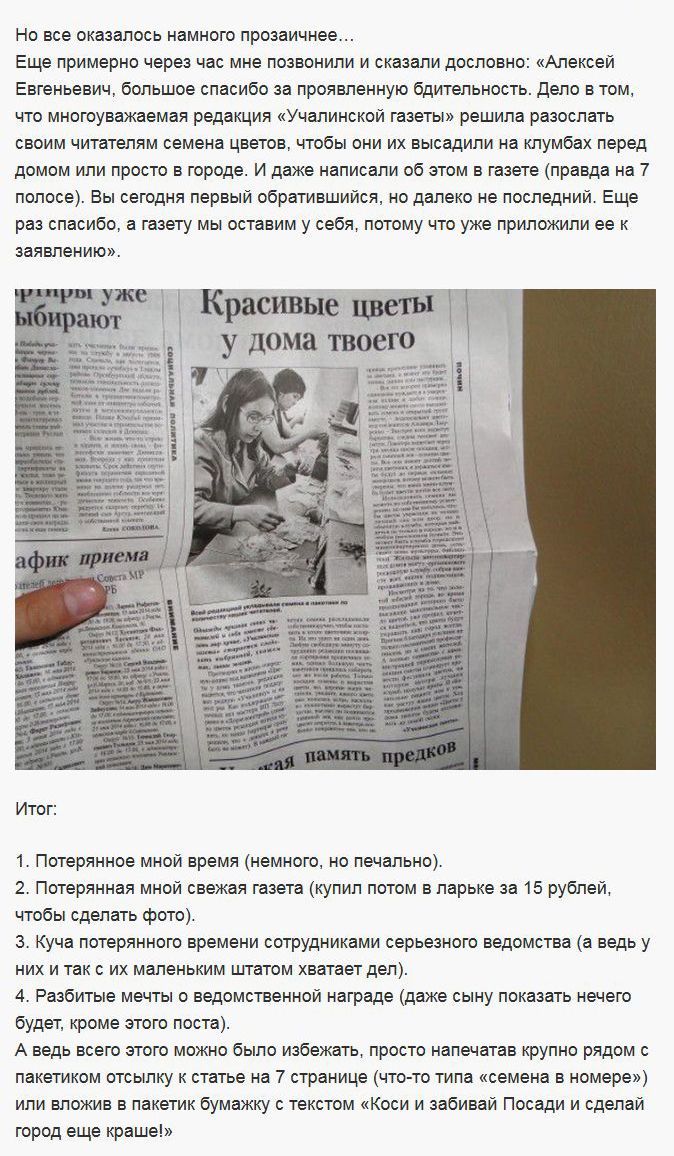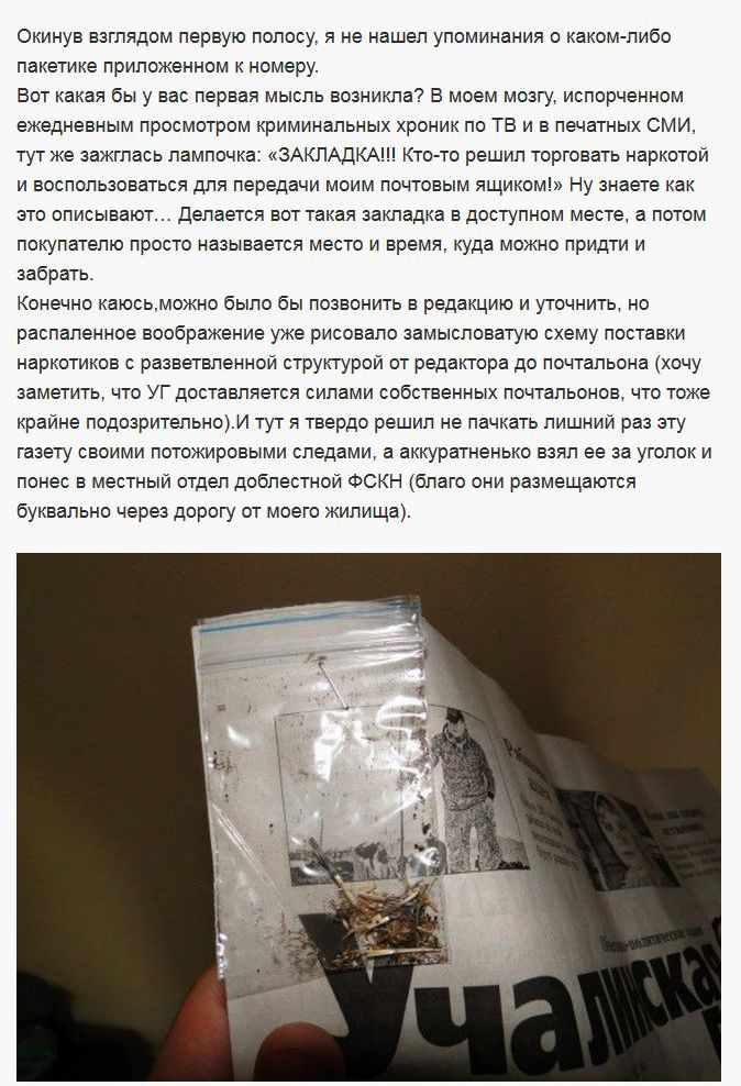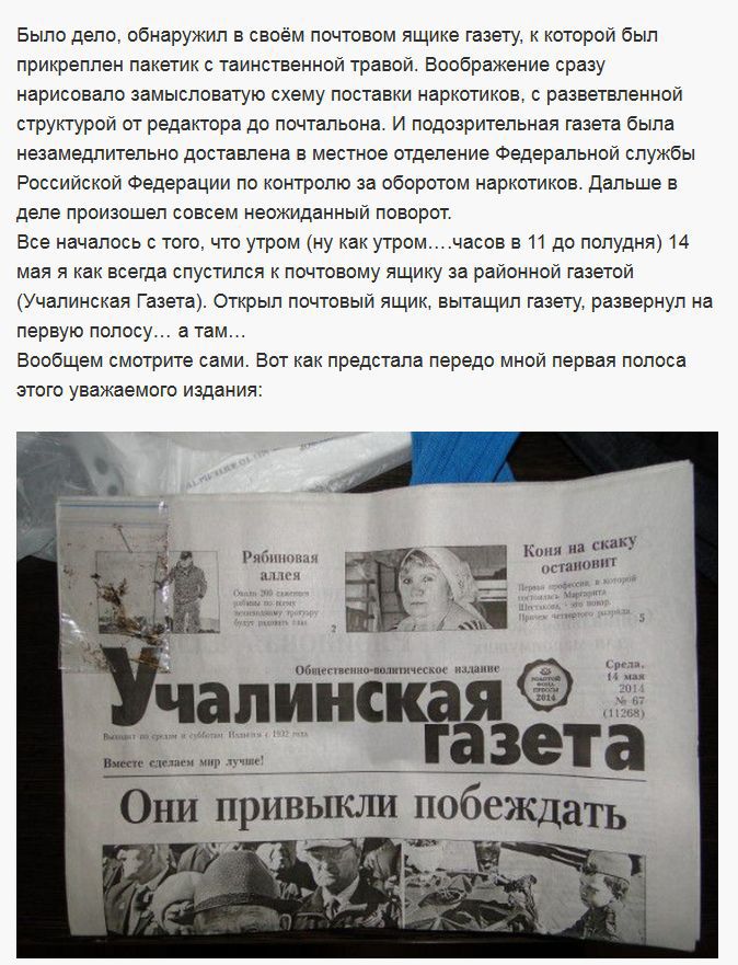 Забавная история приключилась с автором этого рассказа. В своем почтовом ящике он обнаружил газету к которой был приколот пакетик с высушенной «травкой».