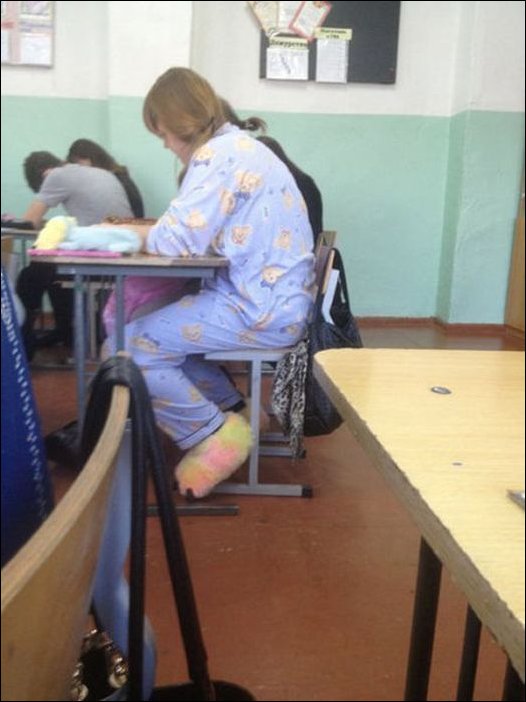 В моё время в школу нельзя было даже брюки одевать, не то, что пижаму :lol: