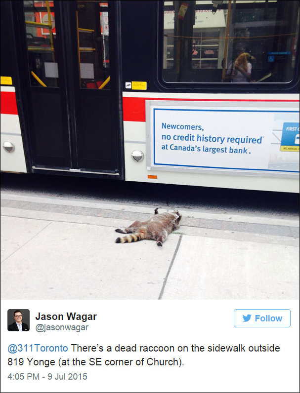 Жители Торонто устроили похороны енота, после того как городские службы в течение 12 часов не убирали мертвое животное с тротуара. Шутники принесли цветы, фотографии, зажгли свечи и вывели в тренд твиттера хэштег #deadraccoonto