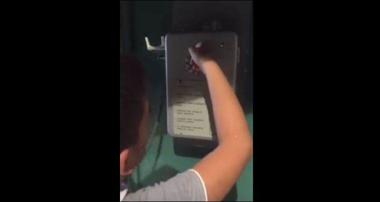 Ребенок пытается набрать номер на дисковом телефоне, но не сообразит как это делать. Папа снимает его попытки на видео и смеется.