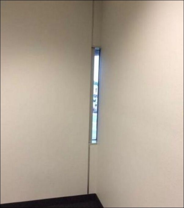 склоняюсь к мысли, что это фотошоп. Не могут так монтажники окно поставить, просто физически нельзя. Окно изнутри не запакетить, створку навесить тем более не получиться. Так установить можно только снаружи с вышки.