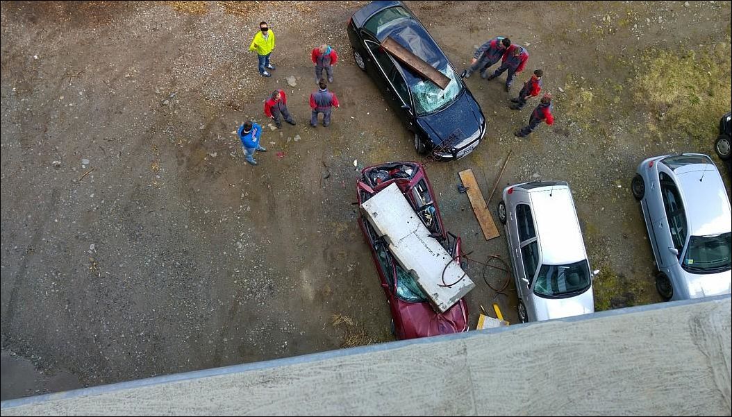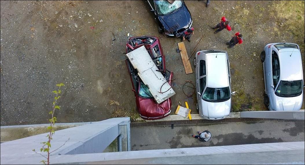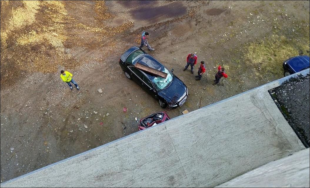 Грузовик протаранил ограждение на парковке и бетонный блок рухнул на припаркованную внизу ауди. Хорошо, в машине никого не было. Никто не пострадал.