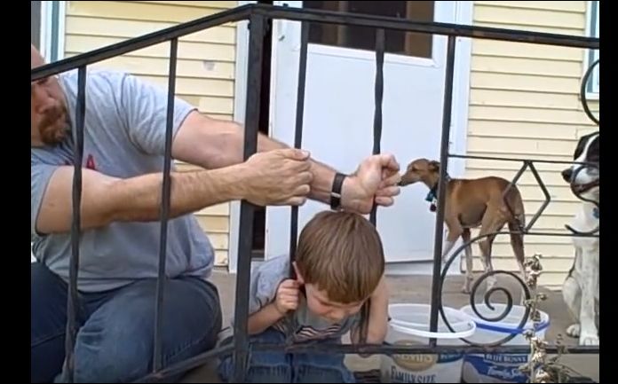 Мальчик застрял головой между прутьями перил. Попытки отца освободить ребенка не увенчались успехом. Тогда мальчик сам нашел способ выбраться. Как говориться, голова пролезла — пролезет и остальное! :)