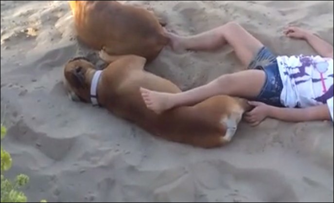 Собака, которой не дали спокойно подремать на песочке, решила закопать нарушителя спокойствия.