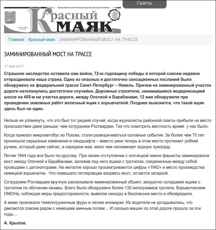 12 мая, при проведении работ на 405-м километре федеральной трассы Санкт-Петербург – Невель, между Опочкой и Барабанами, дорожные строители обнаружили взрывчатку, заложенную под мостом через речку отступавшими фашистскими войсками летом 1944 года. Всего было обнаружено более 130 килограммов тротила. В сутки по этой дороге проносятся тысячи машин.