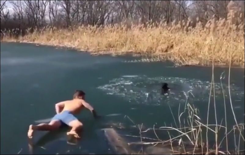 Спасение собаки, провалившейся под лед.